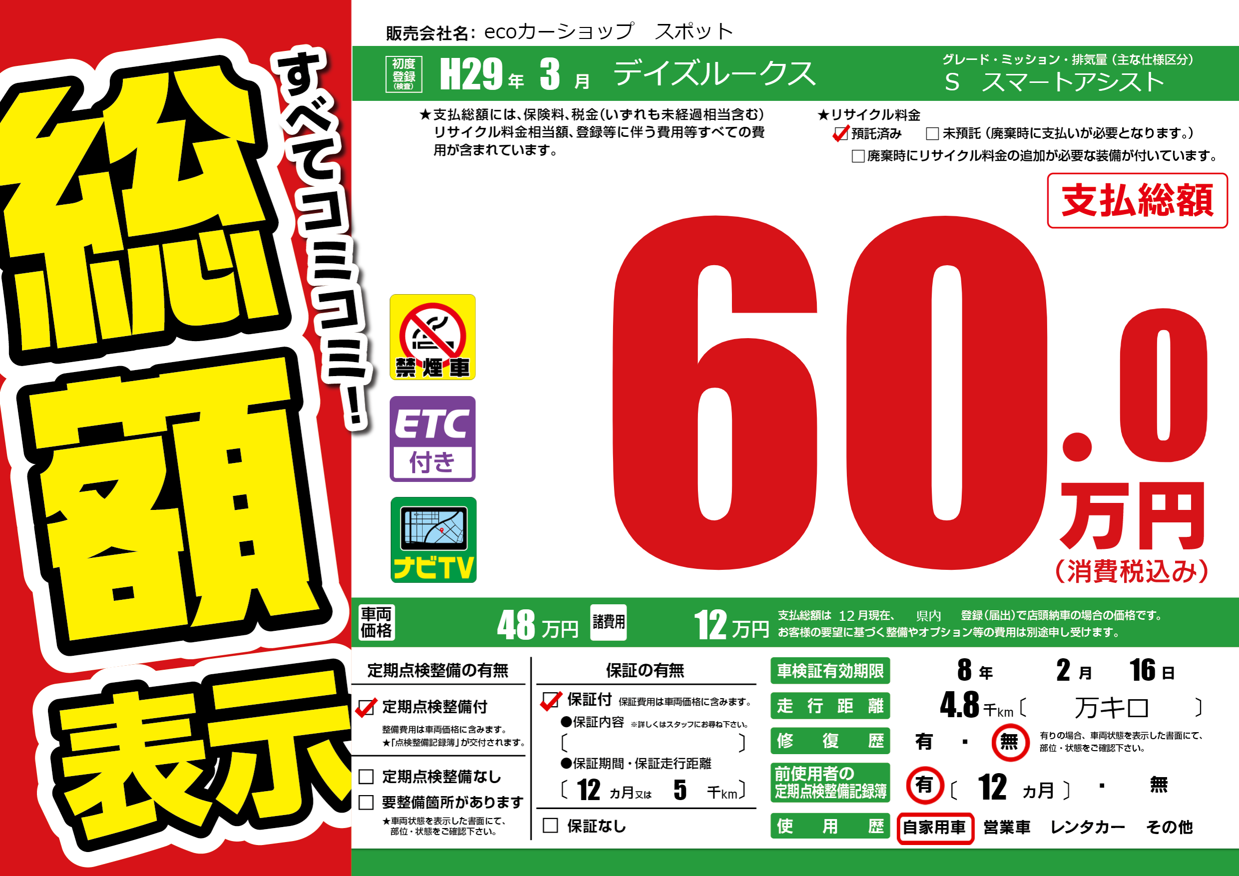 | 走行キロ | 0.4万km | 初年度登録 | H29年3月 |