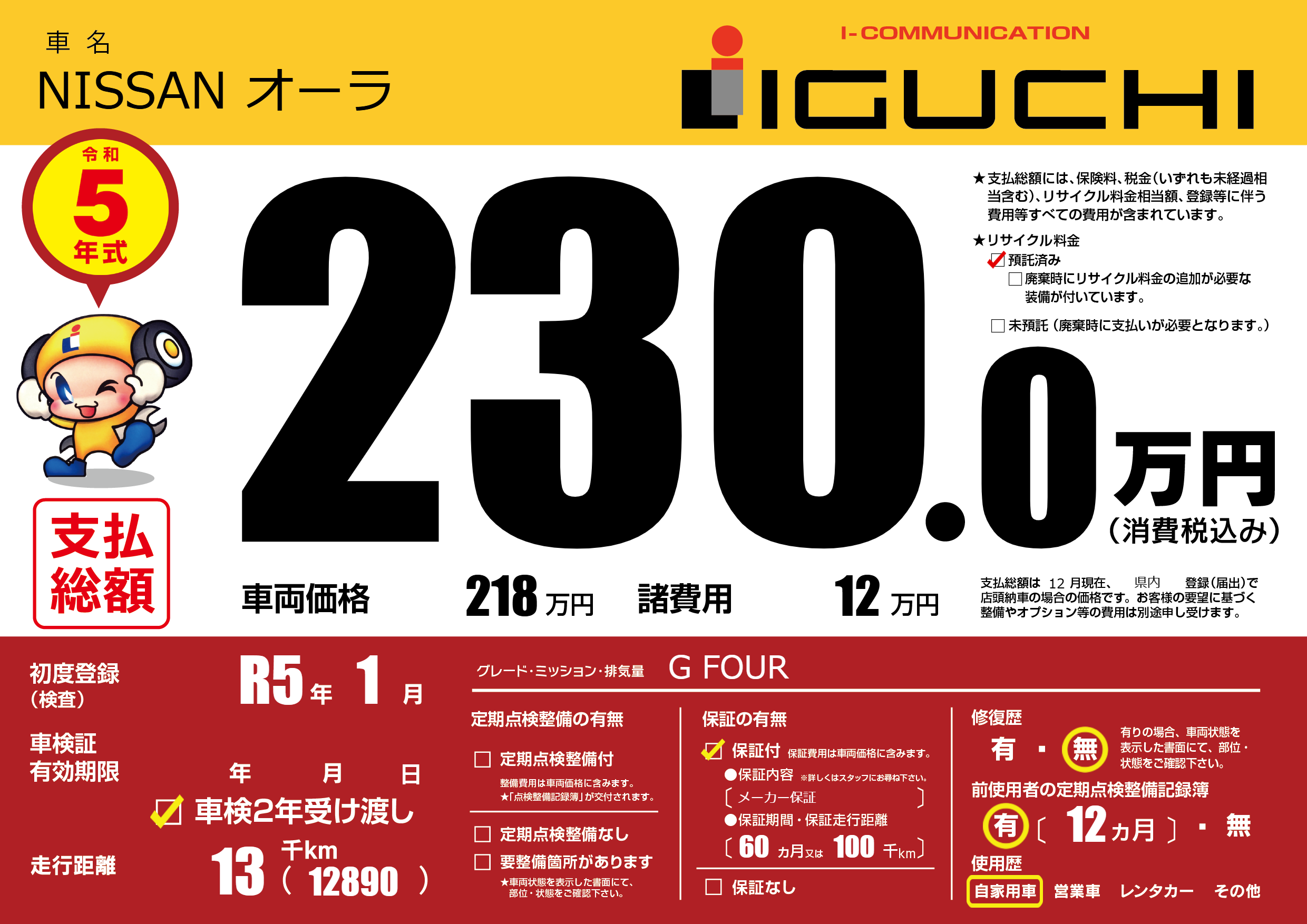 | 車名 | NISSAN オーラ | グレード ミッション 排気量 |