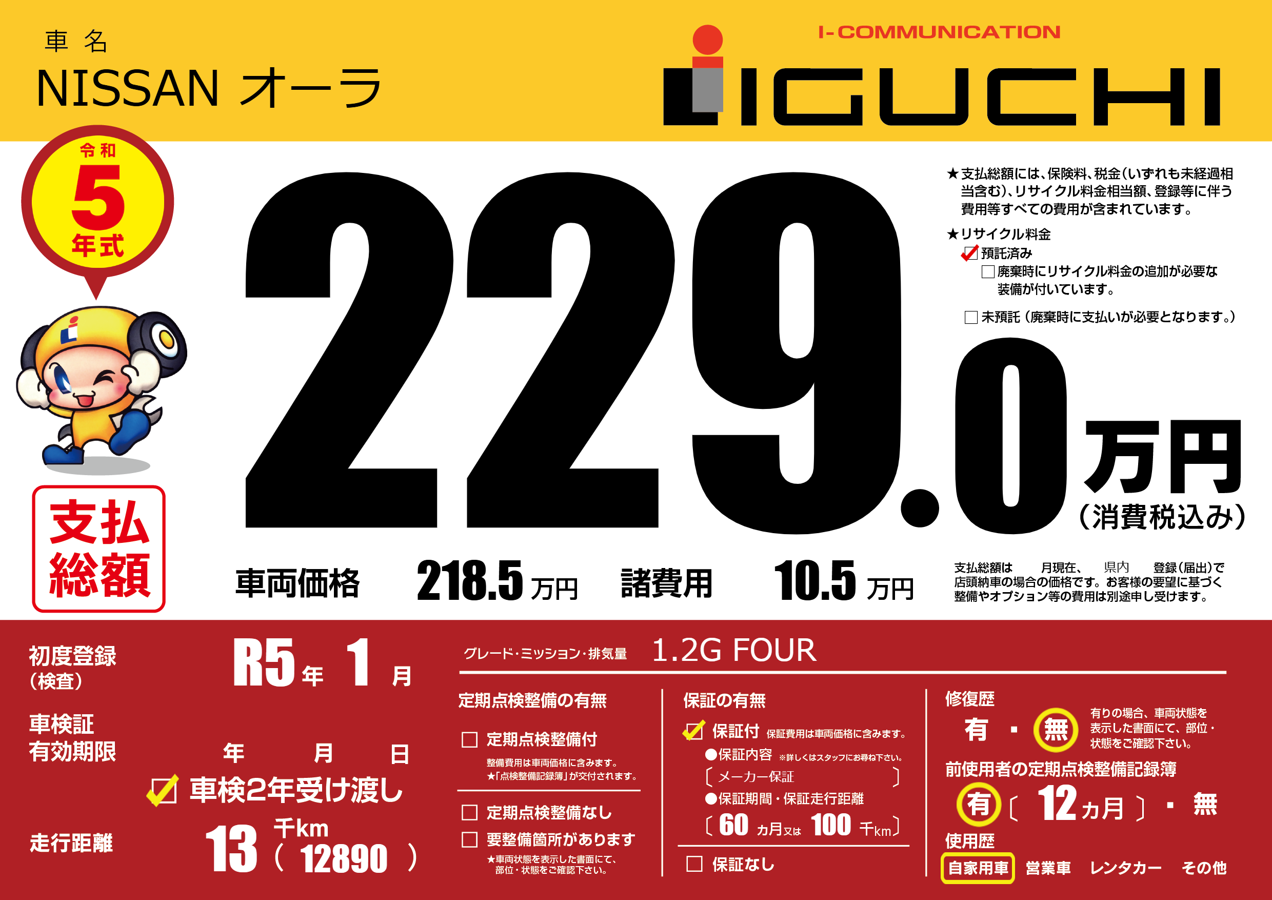 | 車名 | NISSAN オーラ | グレード ミッション 排気量 |