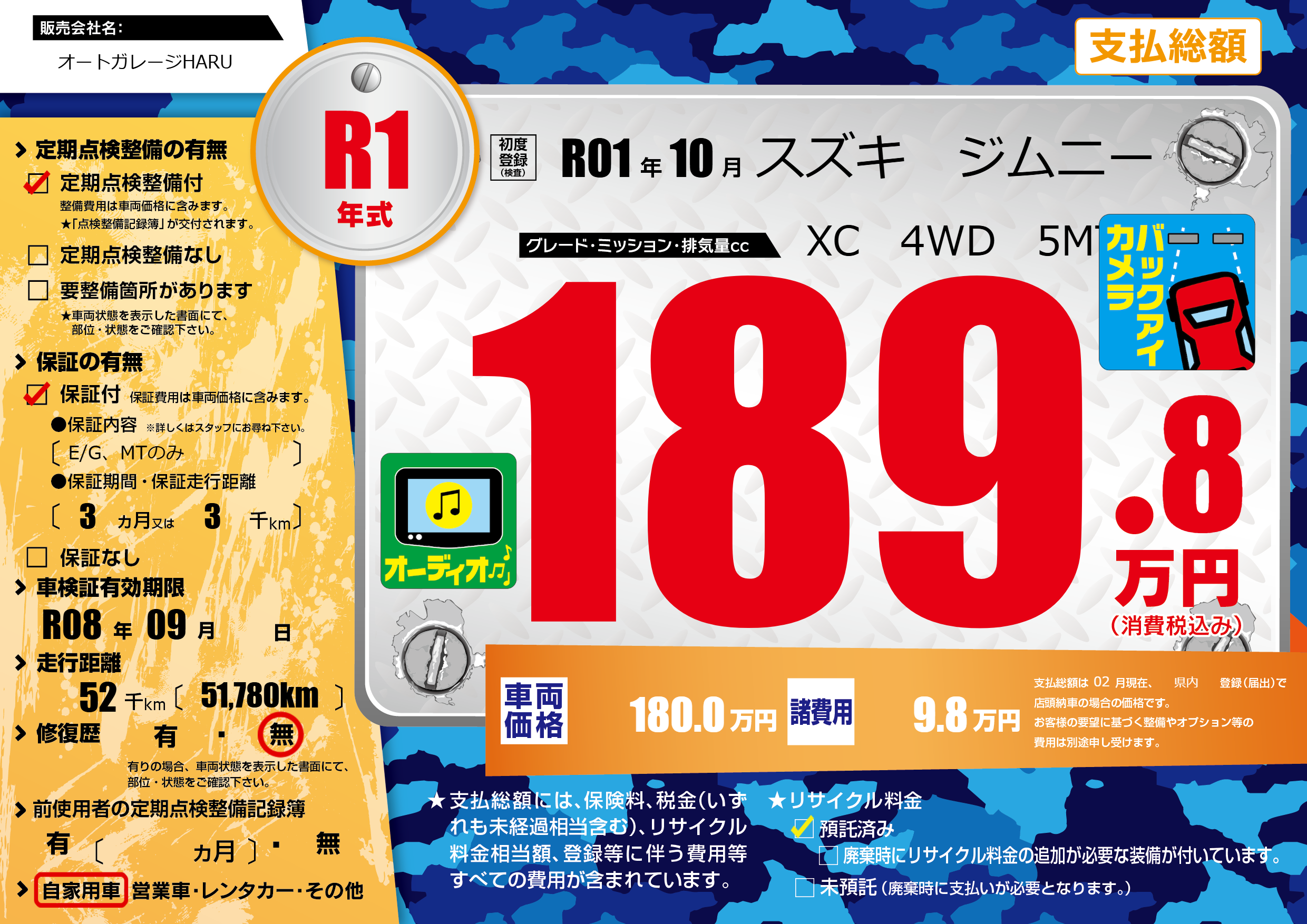 | 車名 | スズキ ジムニー | グレード ミッション 排気量 |