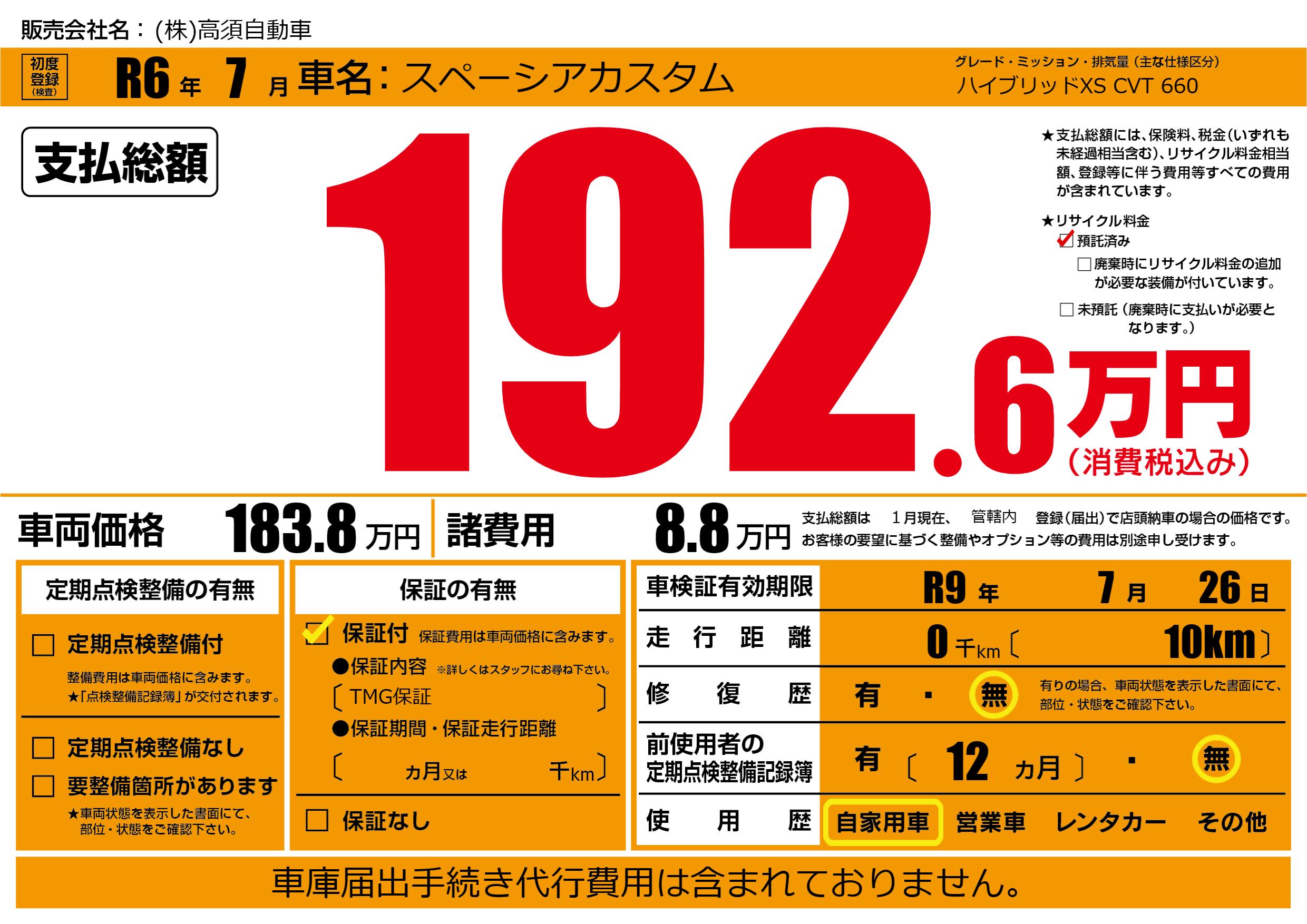 | 車名 | スペーシアカスタム | グレード ミッション 排気量 |