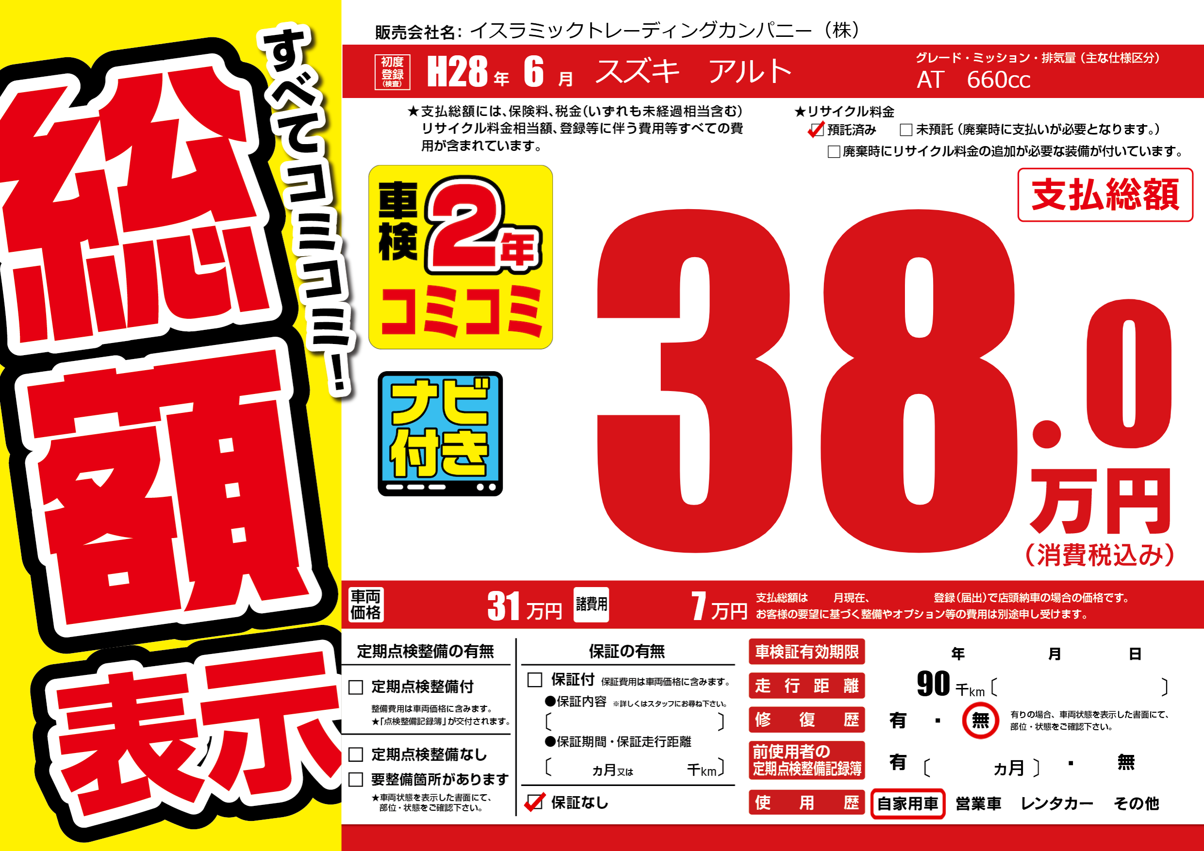 | 車名 | スズキ アルト | グレード ミッション 排気量 |