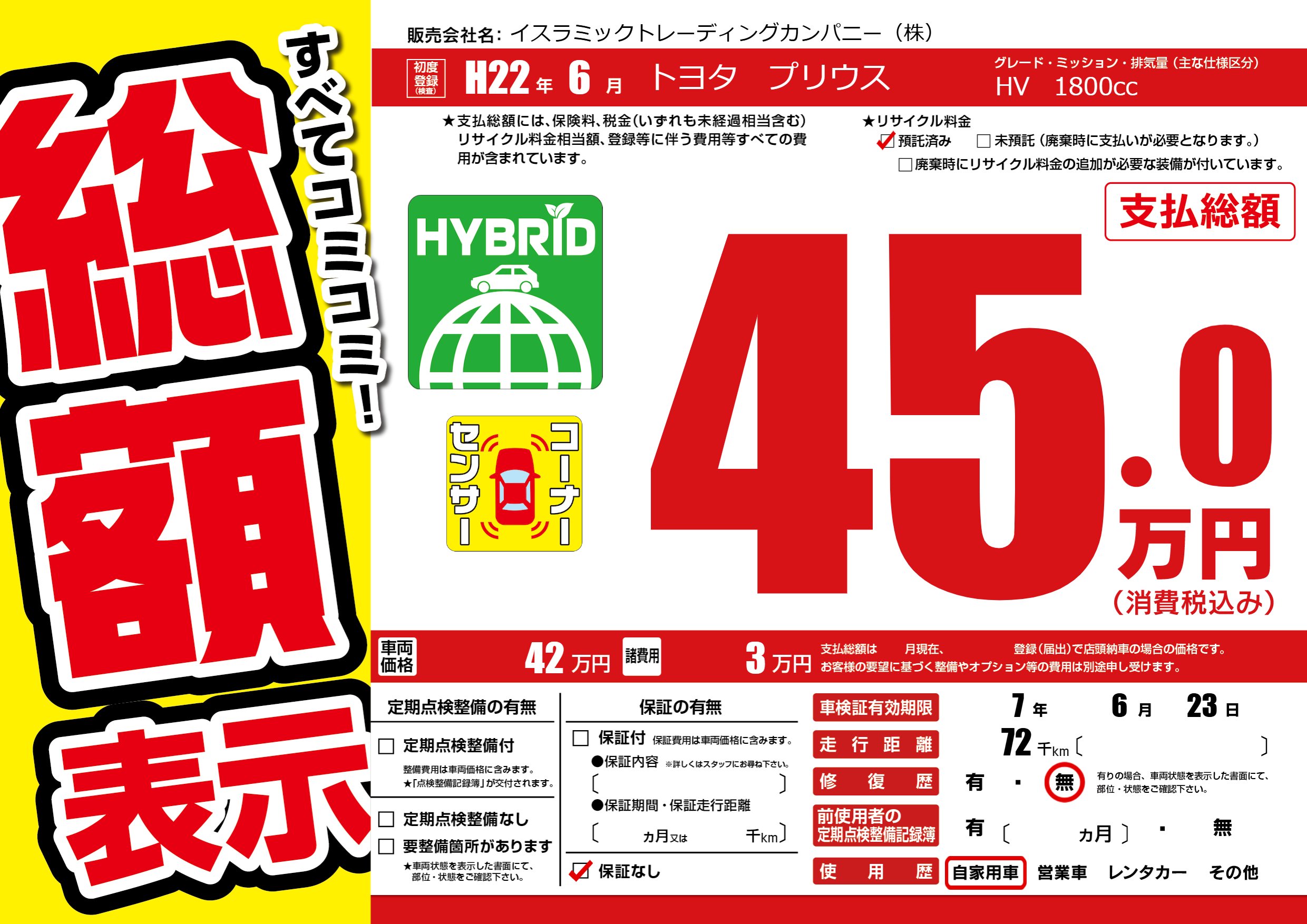 | 車名 | トヨタ プリウス | グレード ミッション 排気量 |