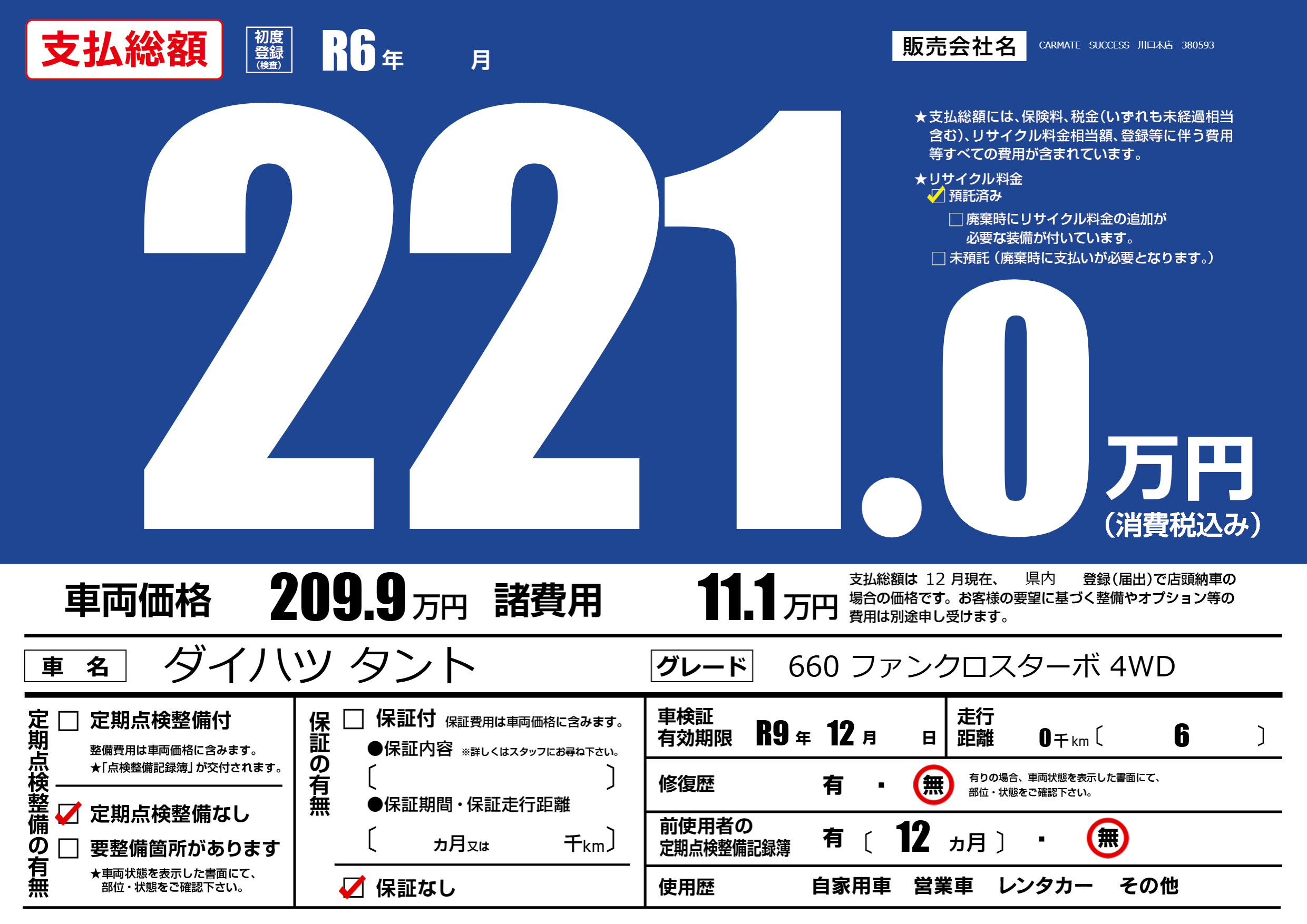 | 車名 | ダイハツ タント | グレード ミッション 排気量 |