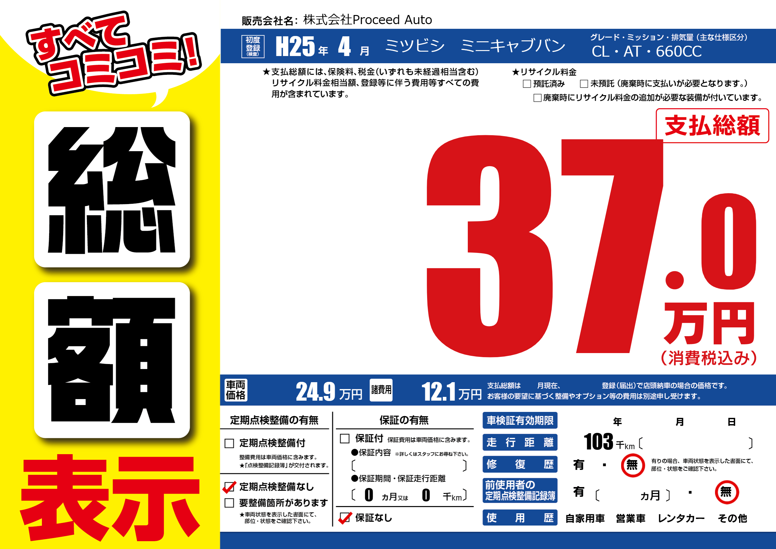 | 車名 | ミツビシ ミニキャブバン | グレード ミッション 排気量 |