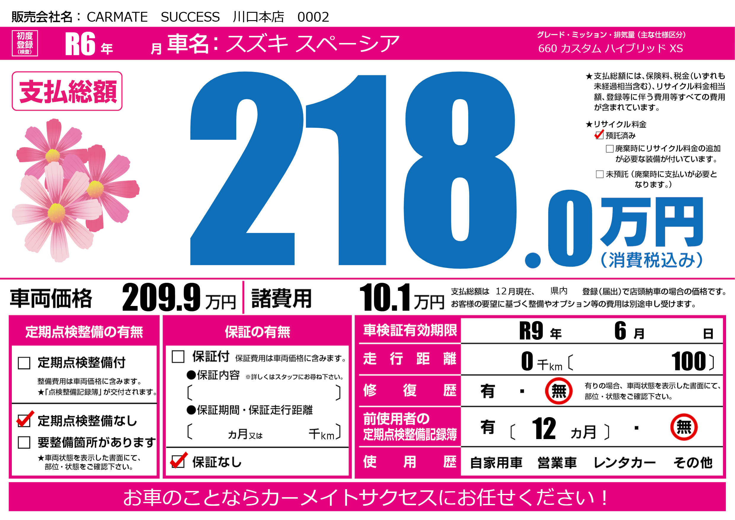 | 車名 | スズキ スペーシア | グレード ミッション 排気量 |