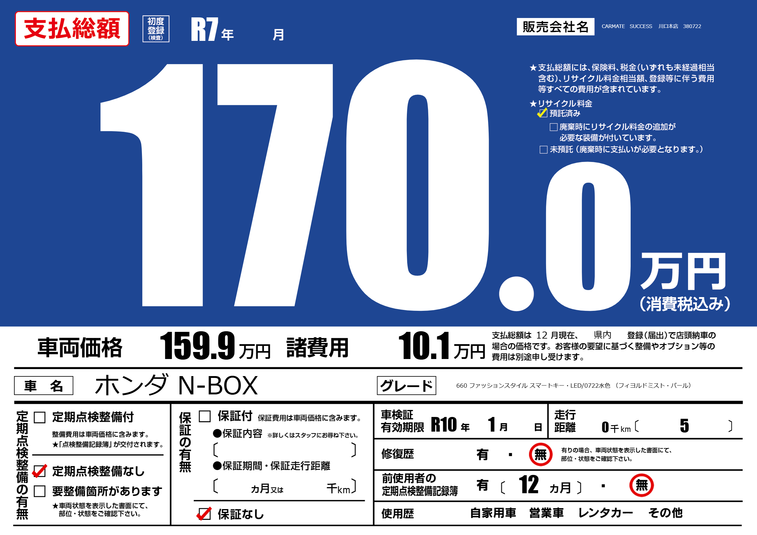 | 車検制限 | R10年 1月 - 日 | ||