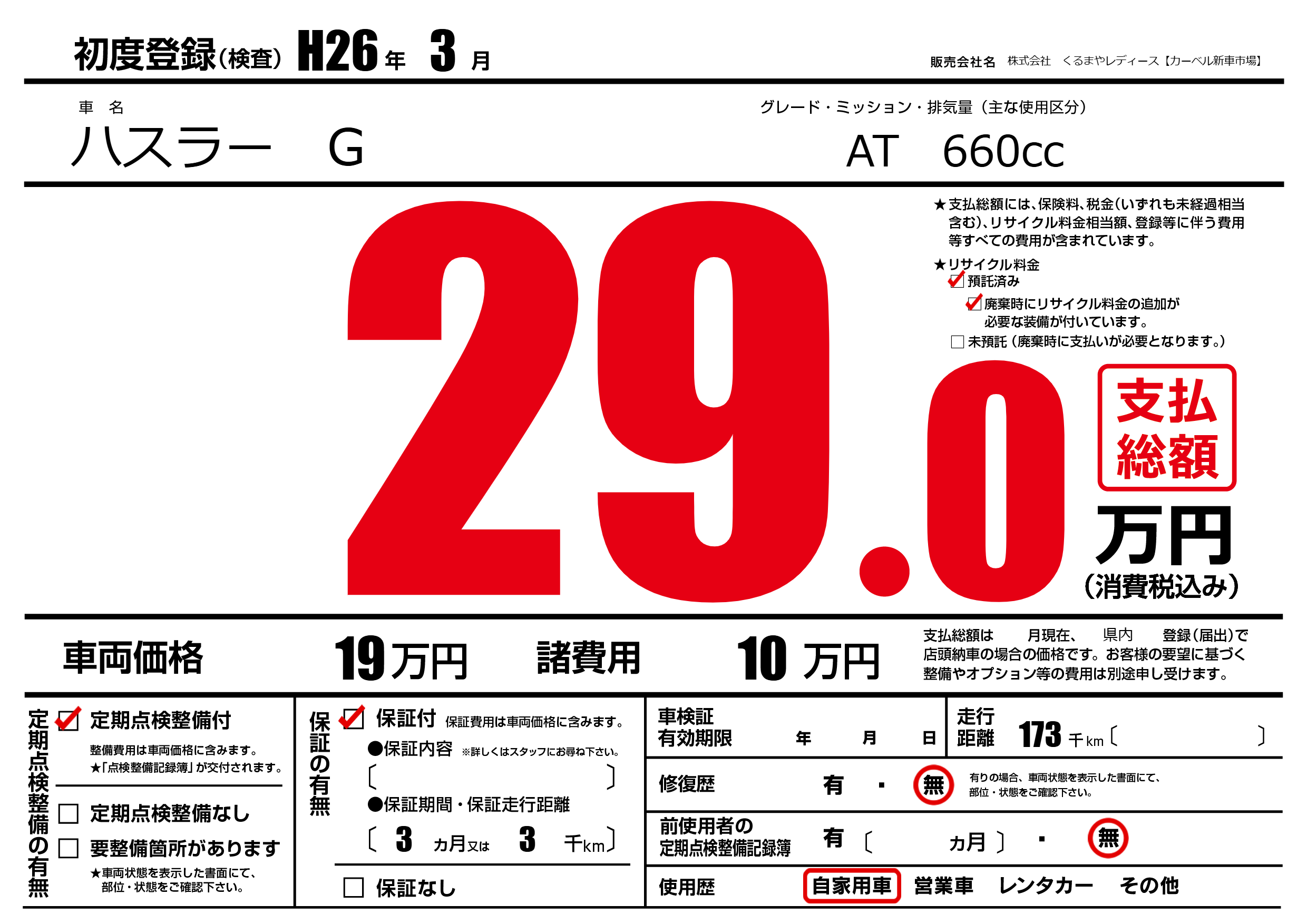 | 走行キロ | 17.3万km | 初年度登録 | H26年3月 |