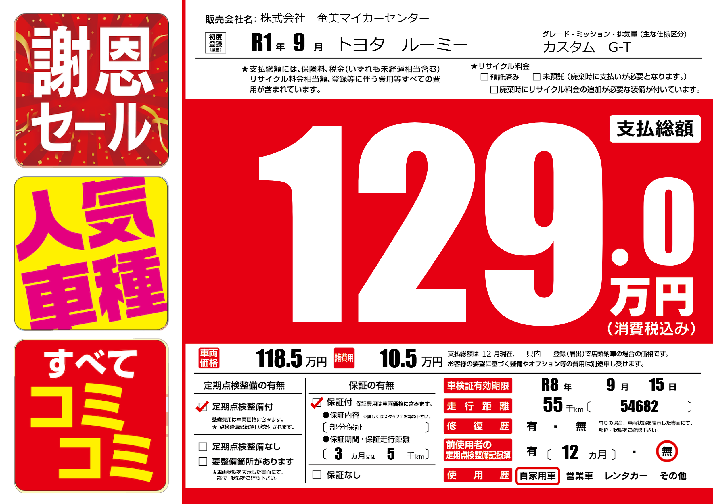 | 車名 | トヨタ ルーミー | グレード ミッション 排気量 |