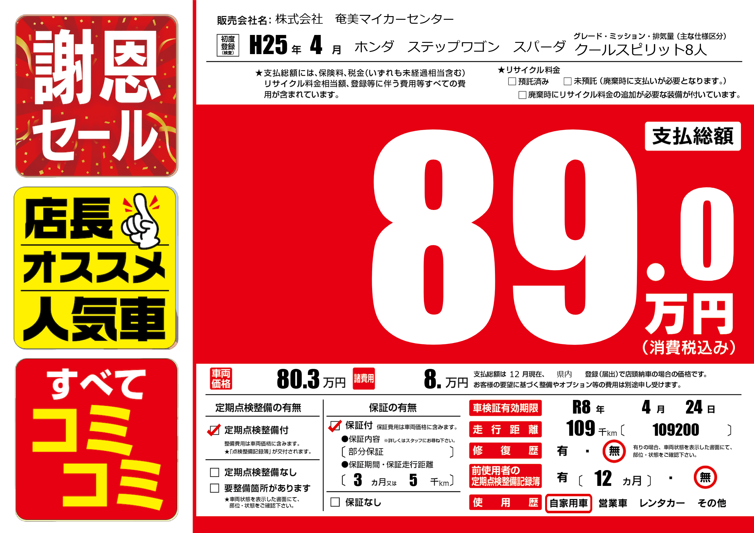 | 走行キロ | 10.9万km | 初年度登録 | H25年4月 |