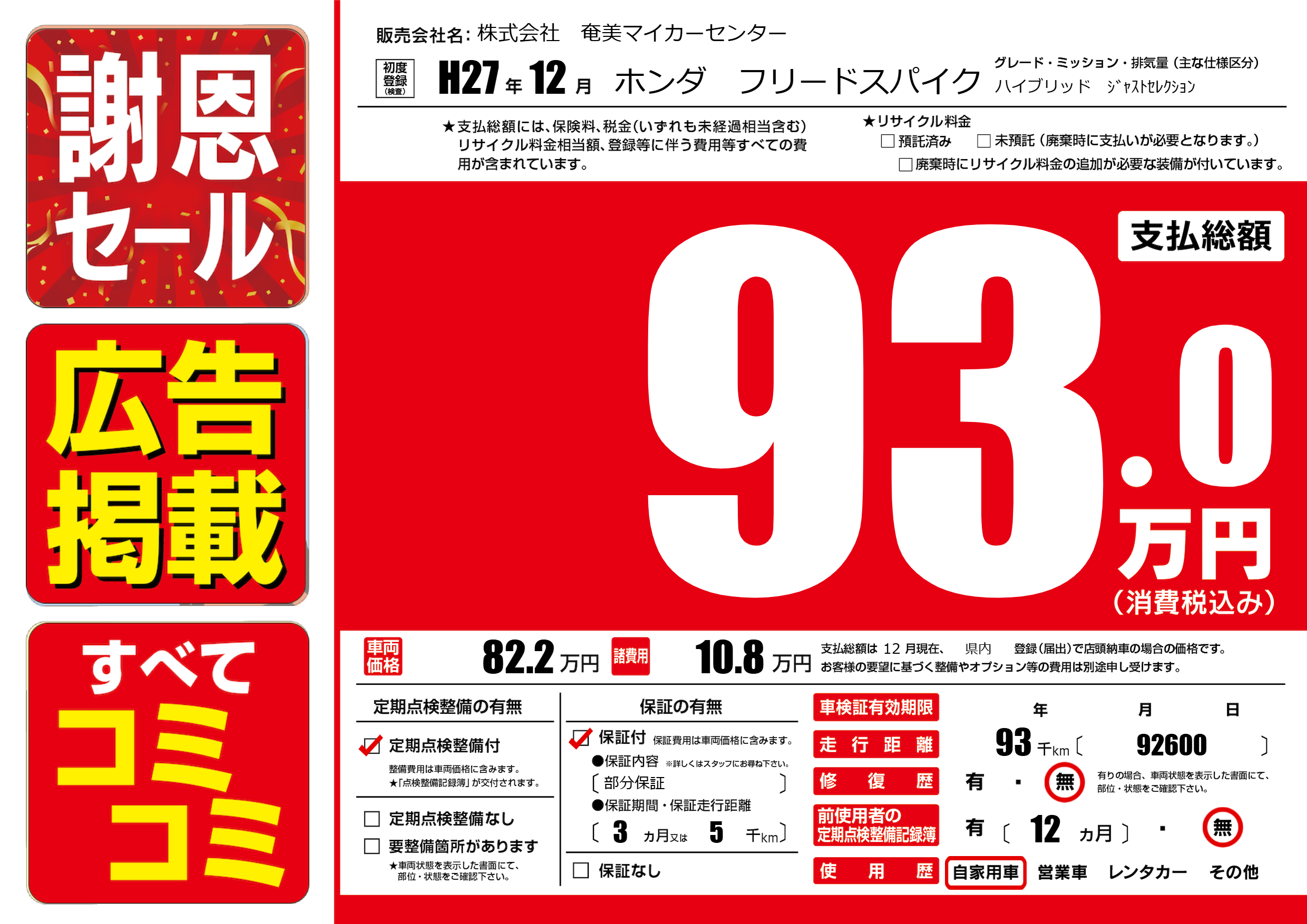 | 走行キロ | 9.3万km | 初年度登録 | H27年12月 |