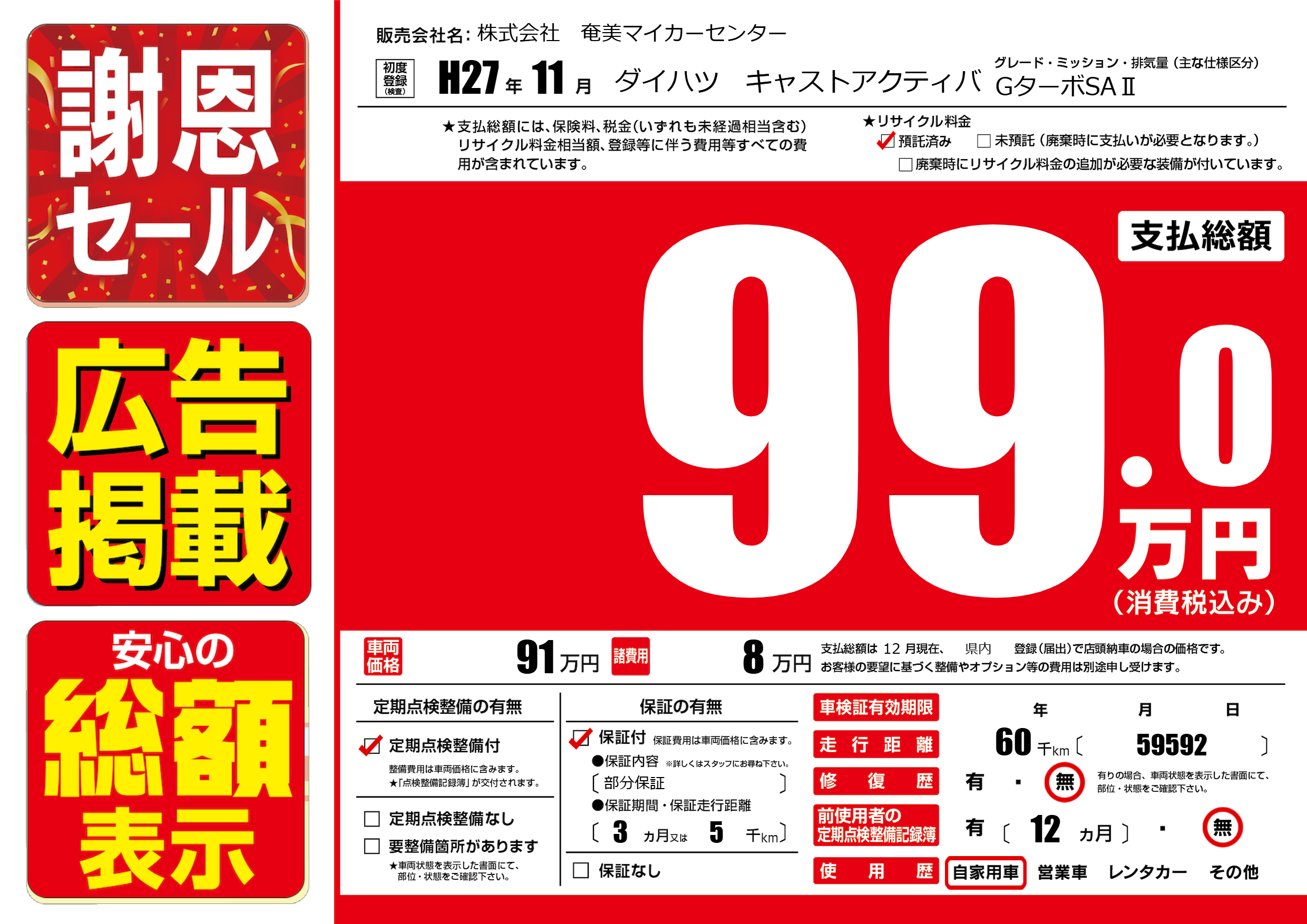| 車名 | ダイハツ キャストアクティバ | グレード ミッション 排気量 |