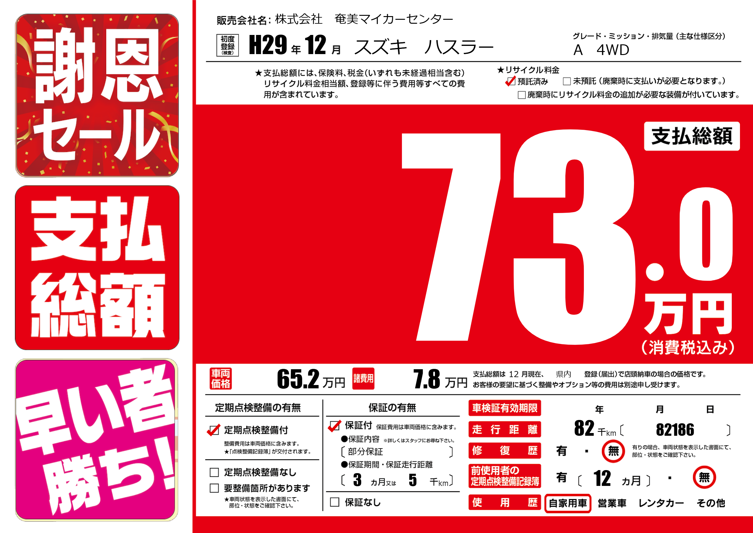| 走行キロ | 8.2万km | 初年度登録 | H29年12月 |