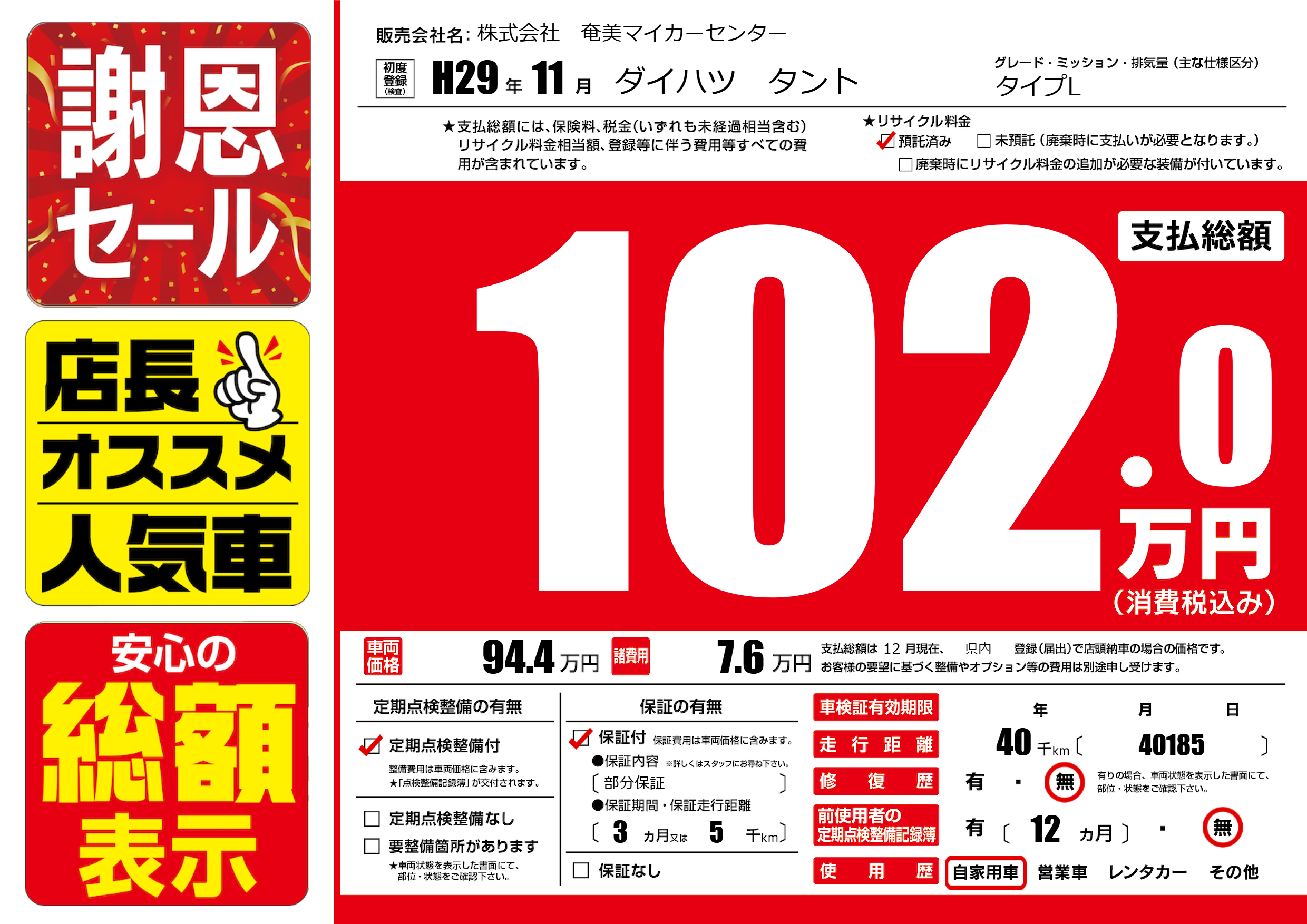 | 走行キロ | 4万km | 初年度登録 | H29年11月 |