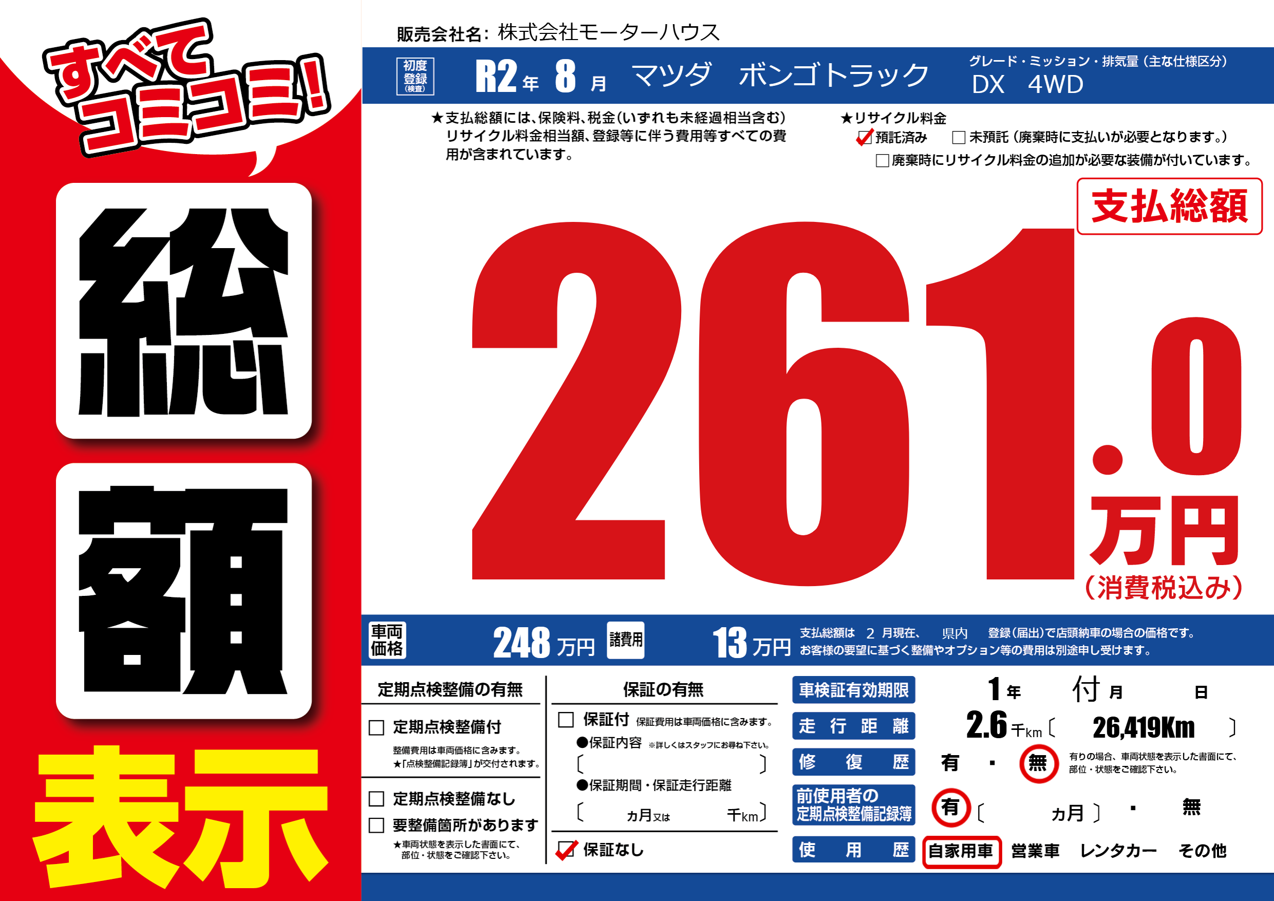 | 車名 | マツダ ボンゴトラック | グレード ミッション 排気量 |