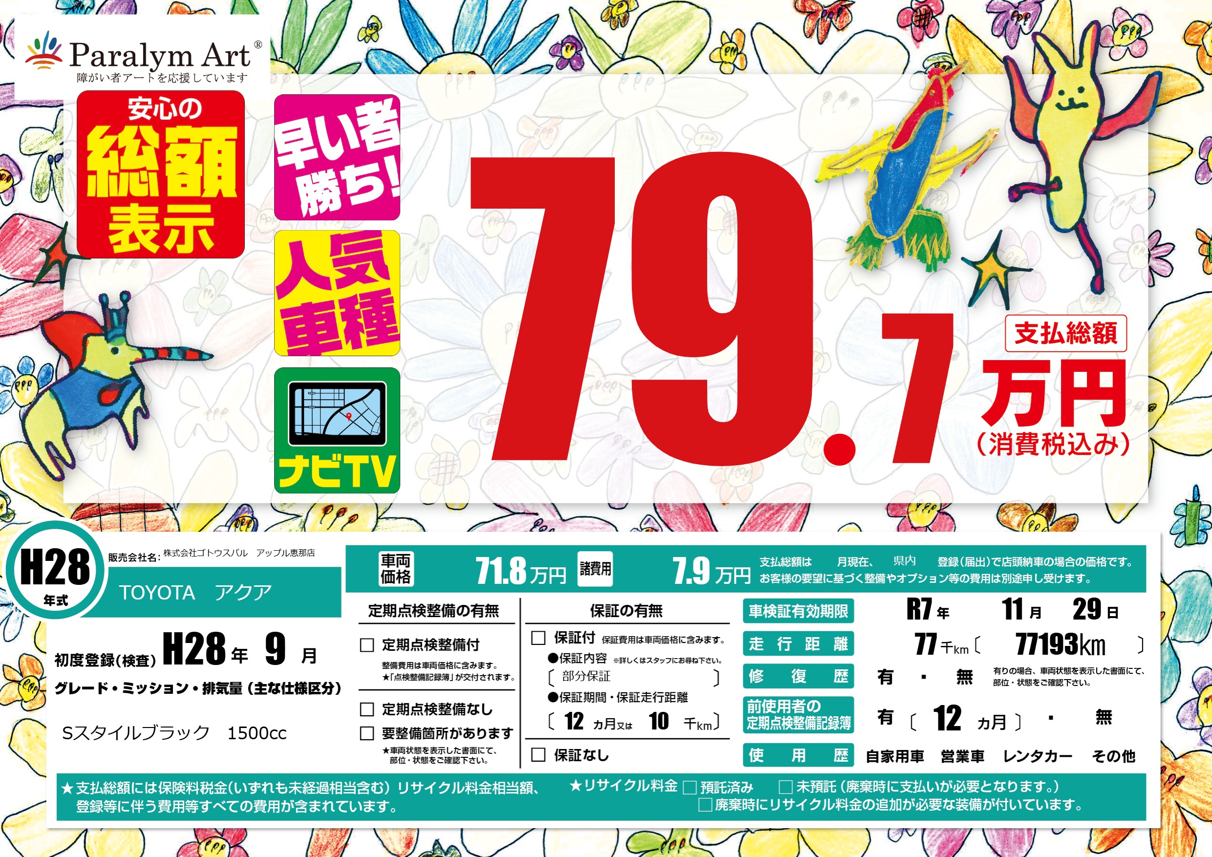 | 走行キロ | 7.7万km | 初年度登録 | H28年9月 |