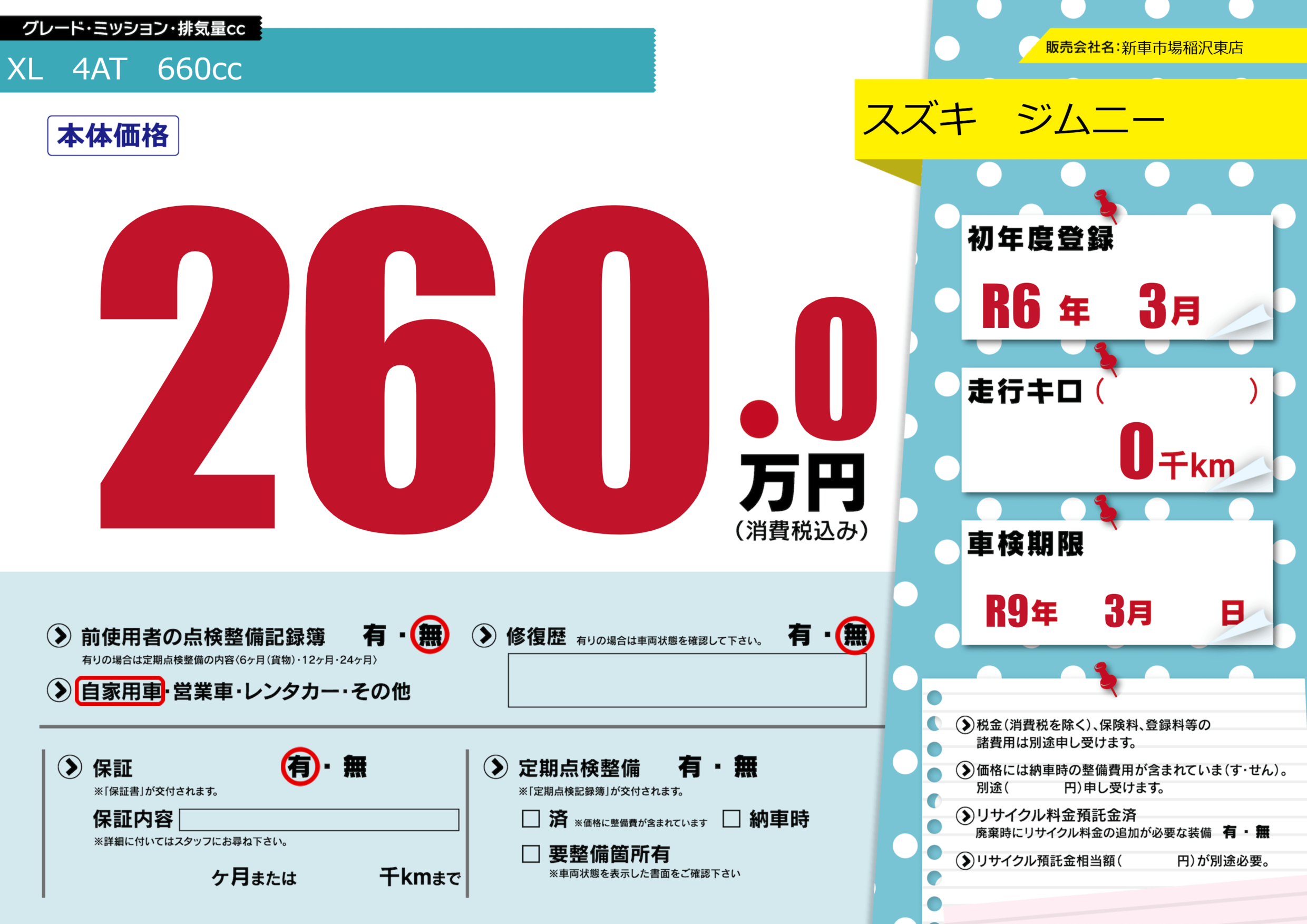 | 車名 | スズキ ジムニー | グレード ミッション 排気量 |