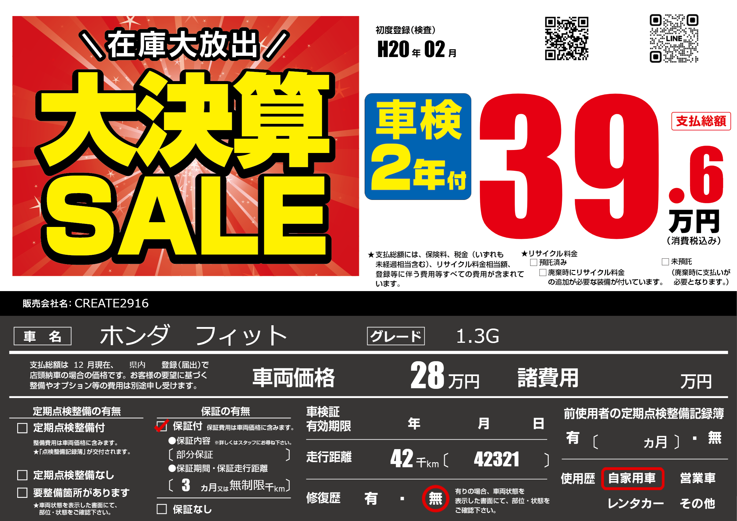 | 走行キロ | 4.2万km | 初年度登録 | H20年02月 |