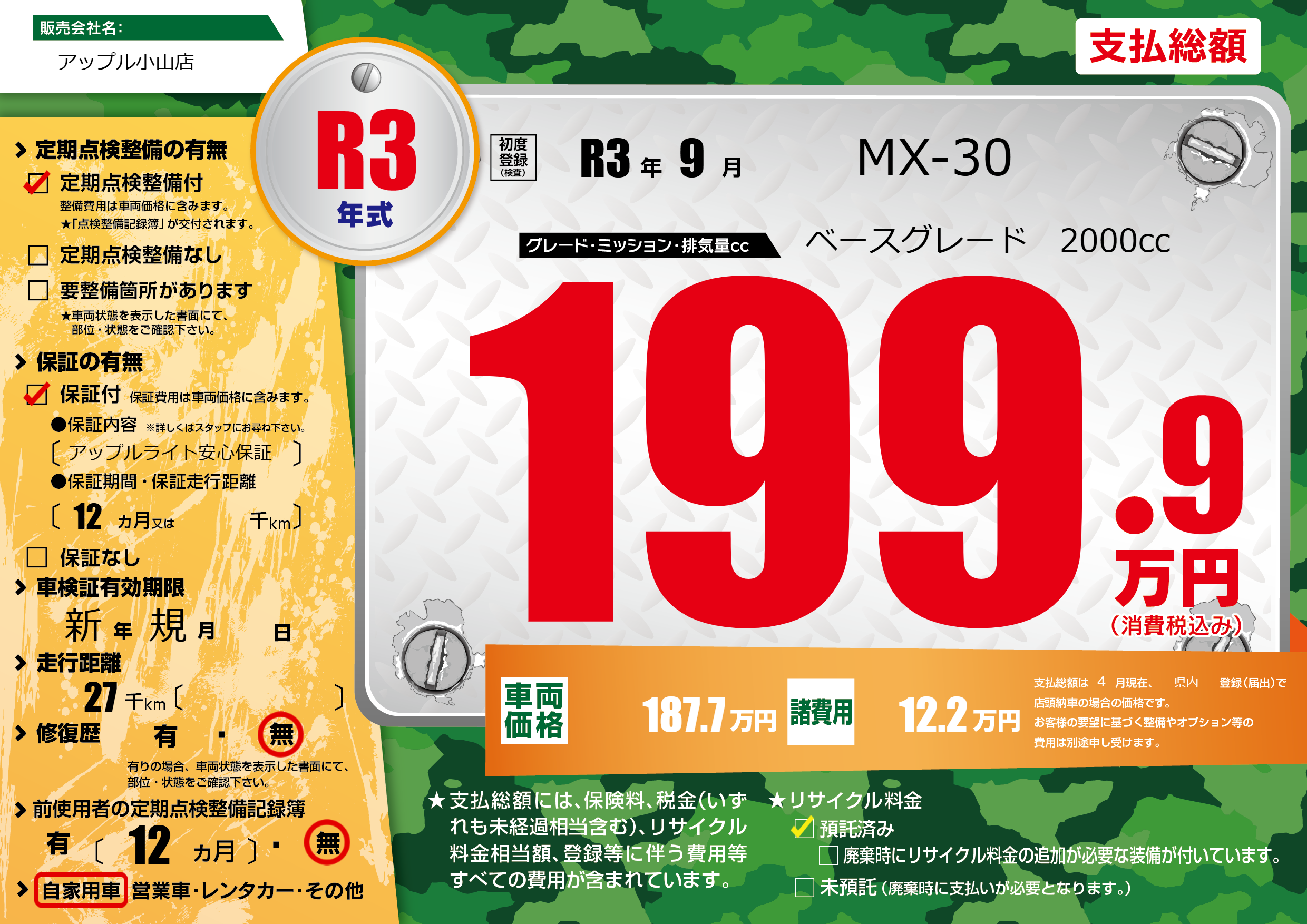 | 車名 | MX-30 | グレード ミッション 排気量 |