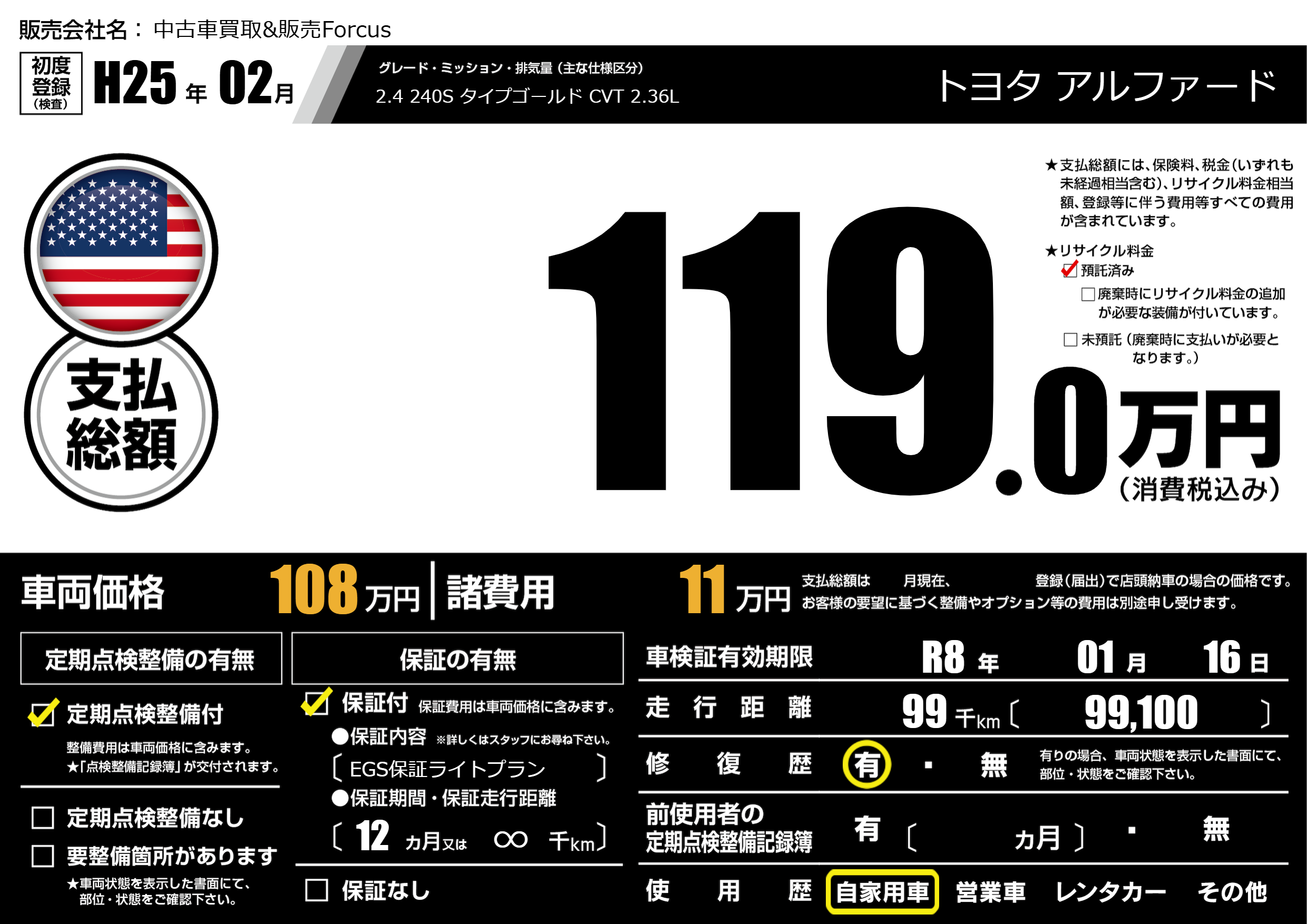 | 車名 | トヨタ アルファード | グレード ミッション 排気量 |