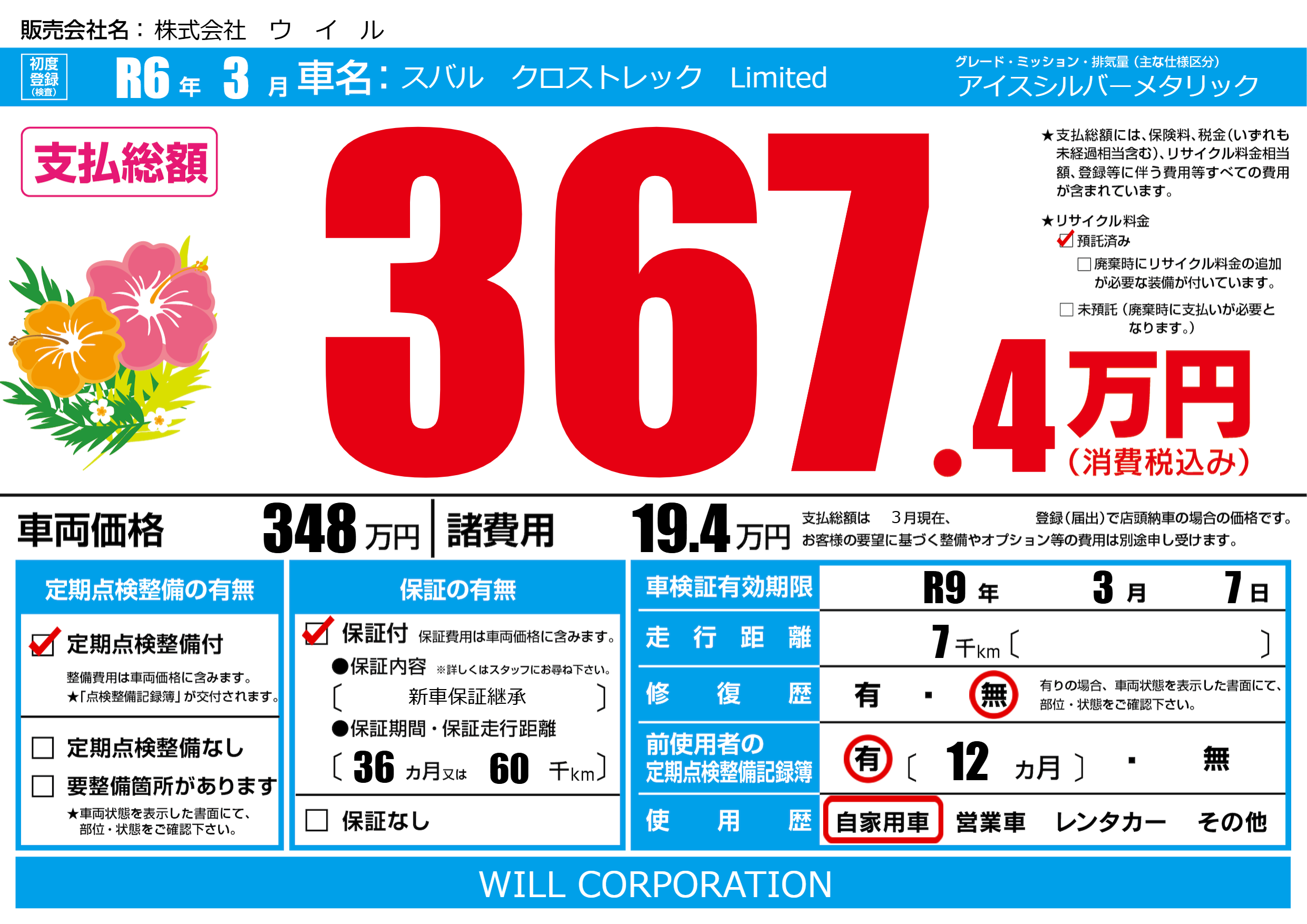 | 車名 | スバル クロストレック Limited | グレード ミッション 排気量 |