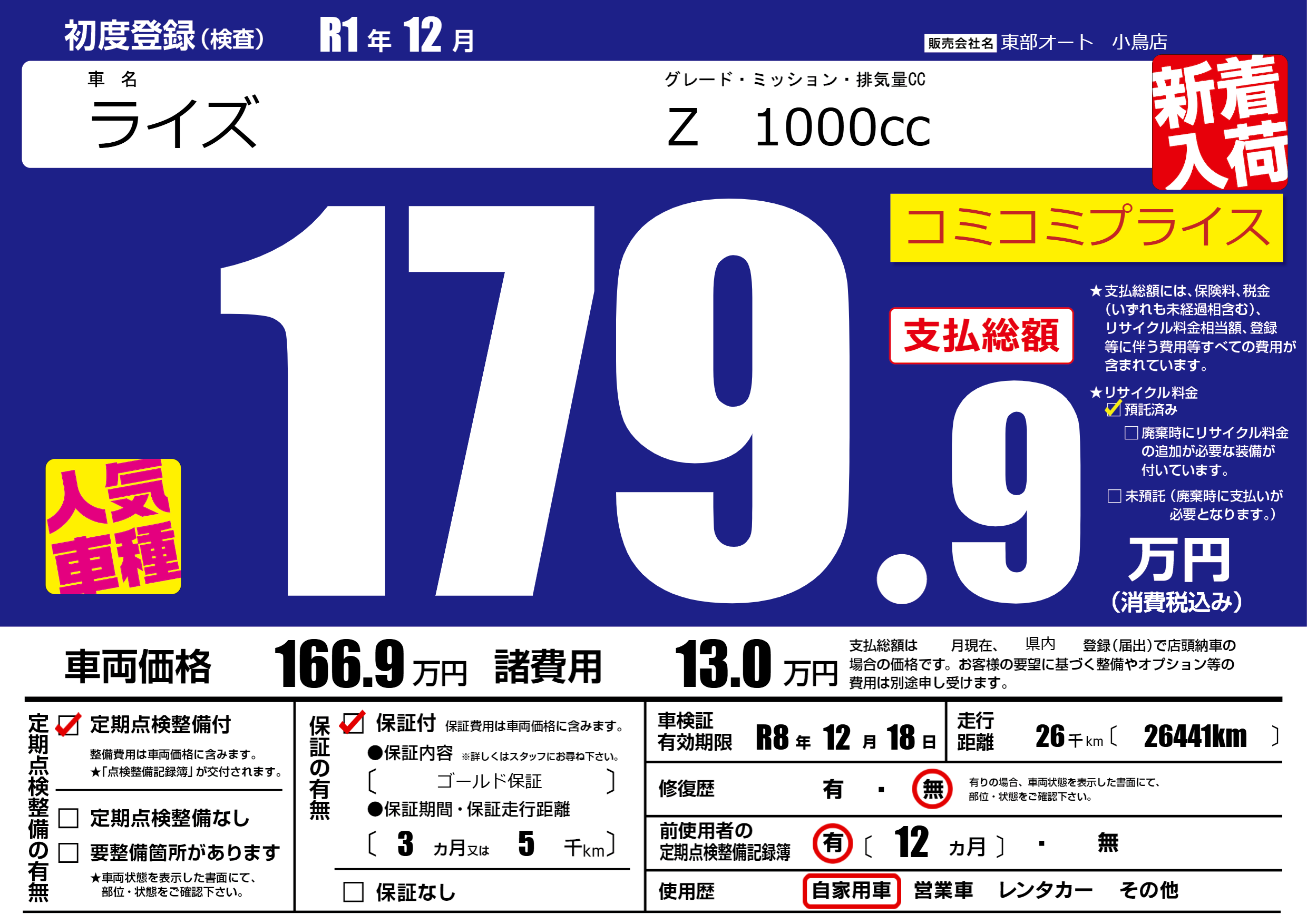 | 走行キロ | 2.6万km | 初年度登録 | R1年12月 |