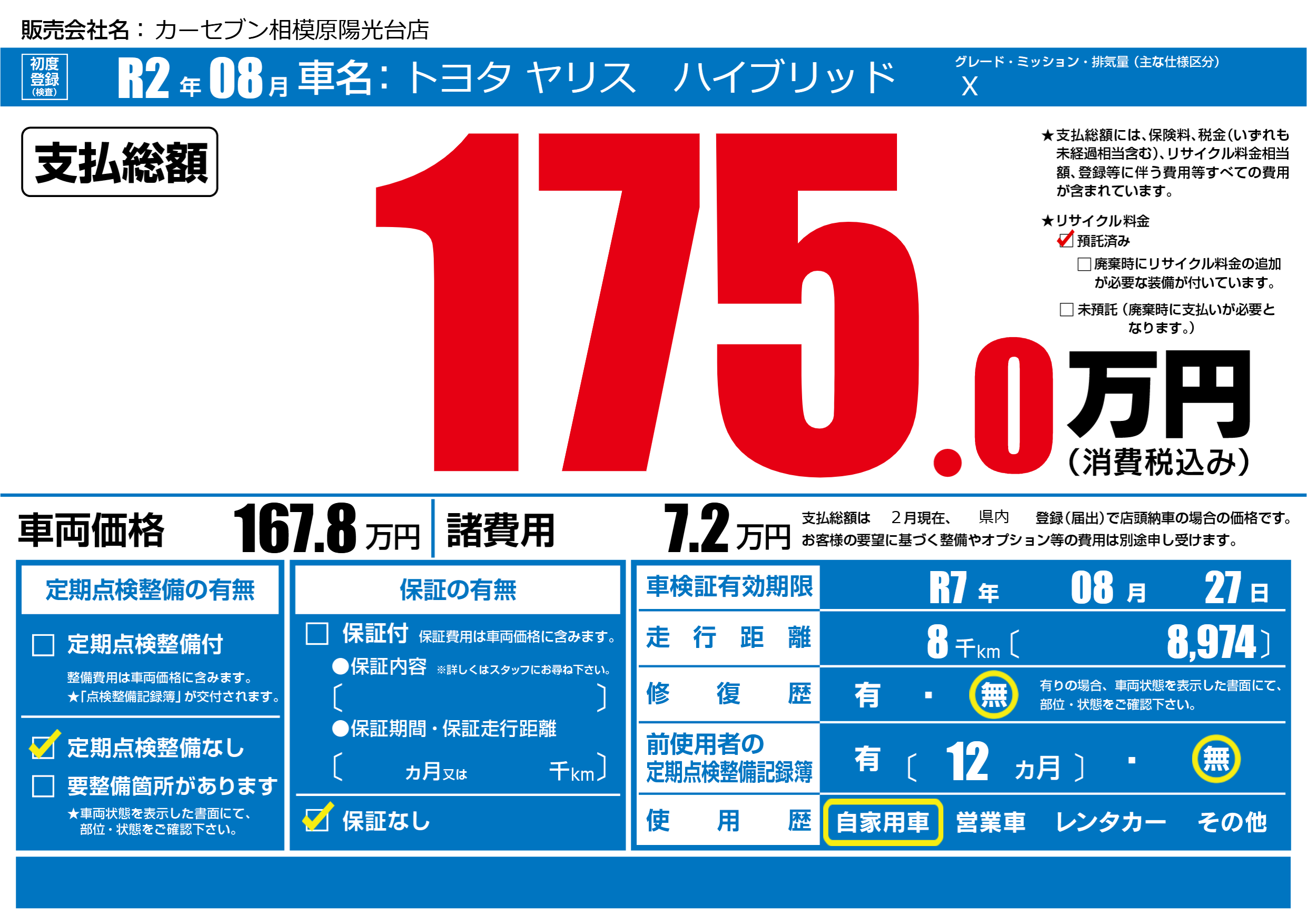 | 車名 | トヨタ ヤリス ハイブリッド | グレード ミッション 排気量 |