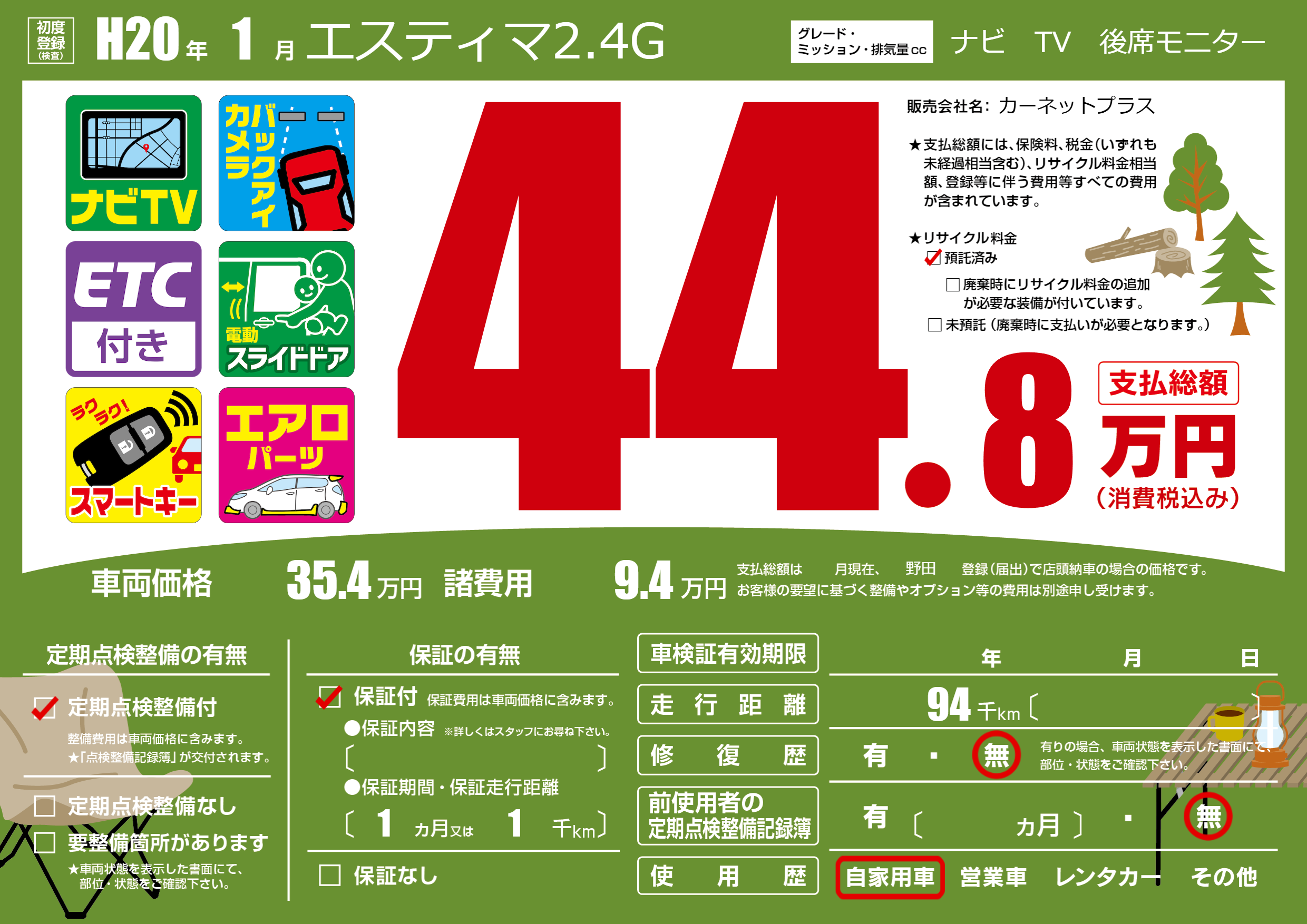 | 車名 | エスティマ2.4G | グレード ミッション 排気量 |
