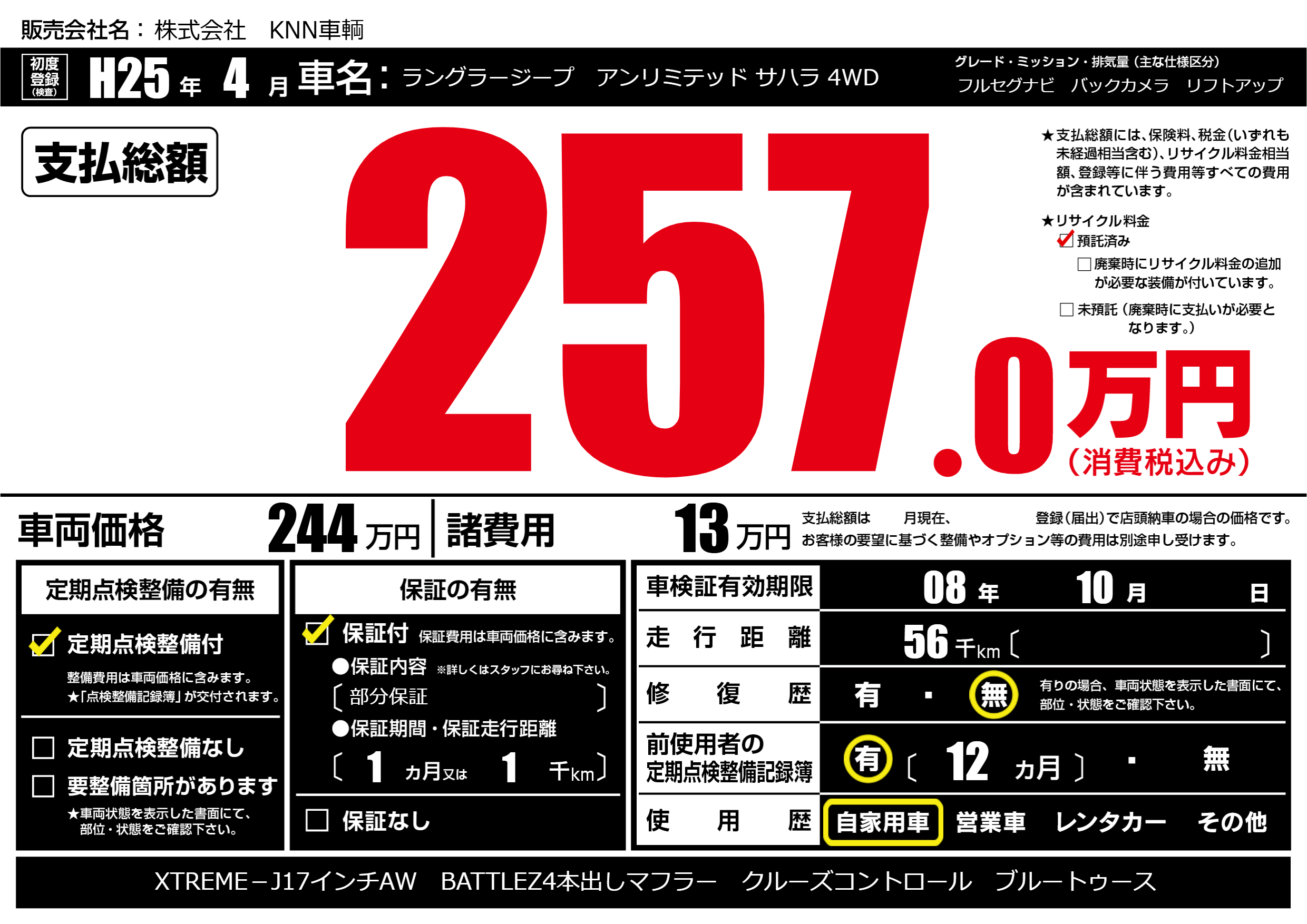 | 車名 | ラングラージープ アンリミテッド サハラ 4WD | グレード ミッション 排気量 |