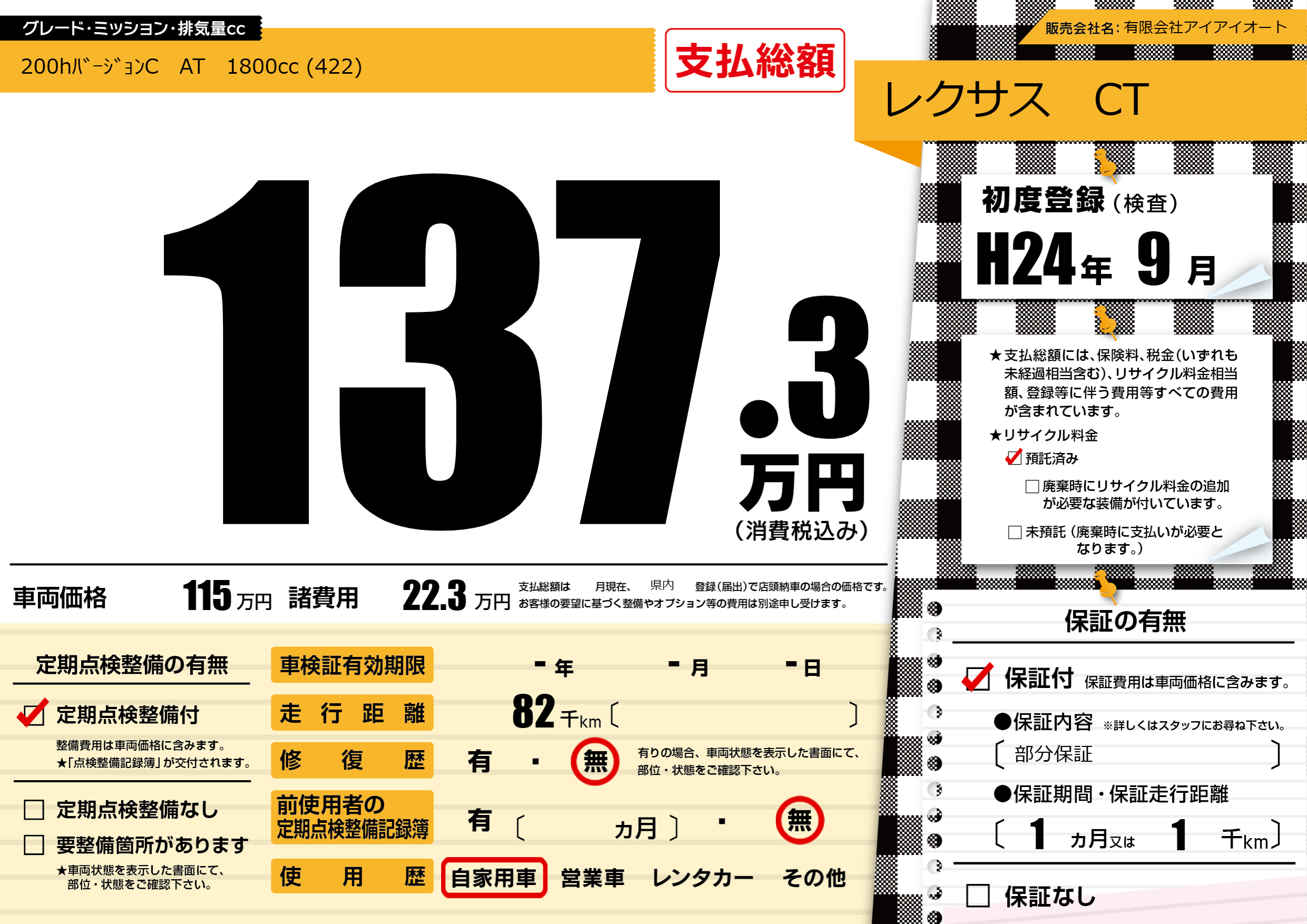 | 車名 | レクサス CT | グレード ミッション 排気量 |