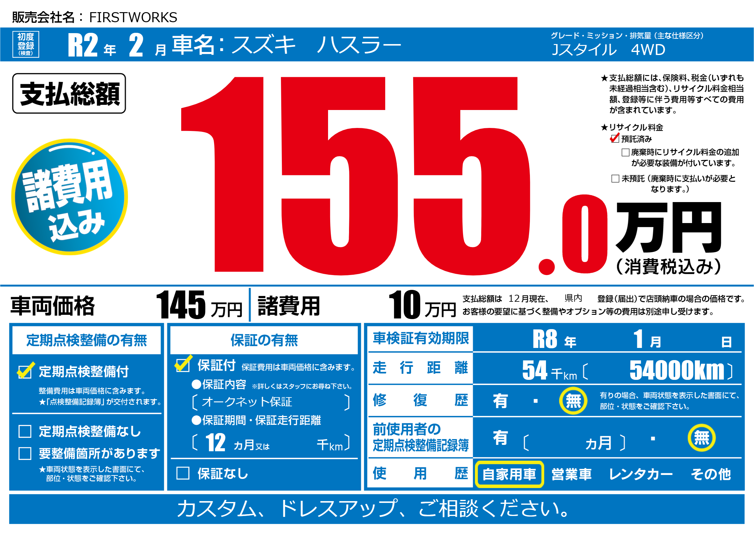 | 車検制限 | R8年 1月 - 日 | ||