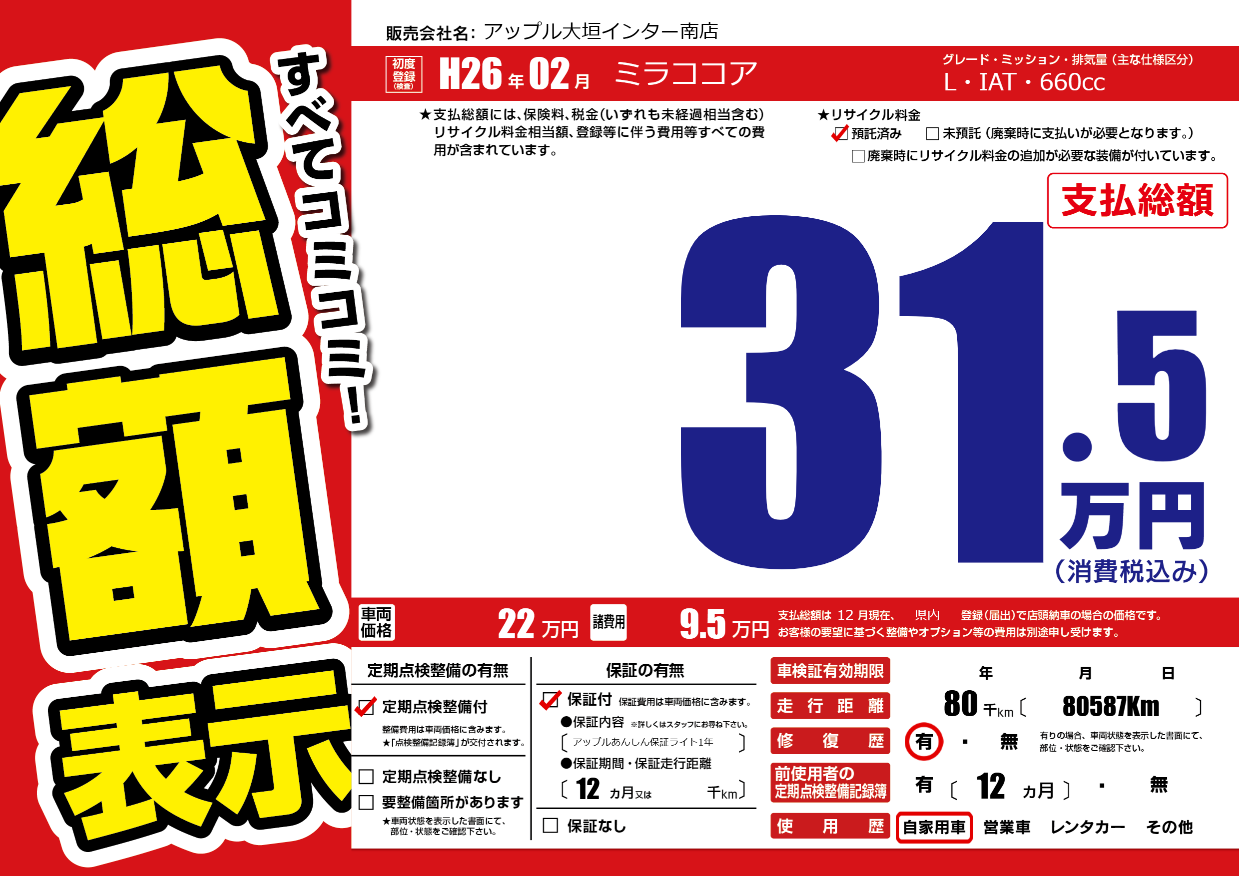 | 走行キロ | 8万km | 初年度登録 | H26年02月 |