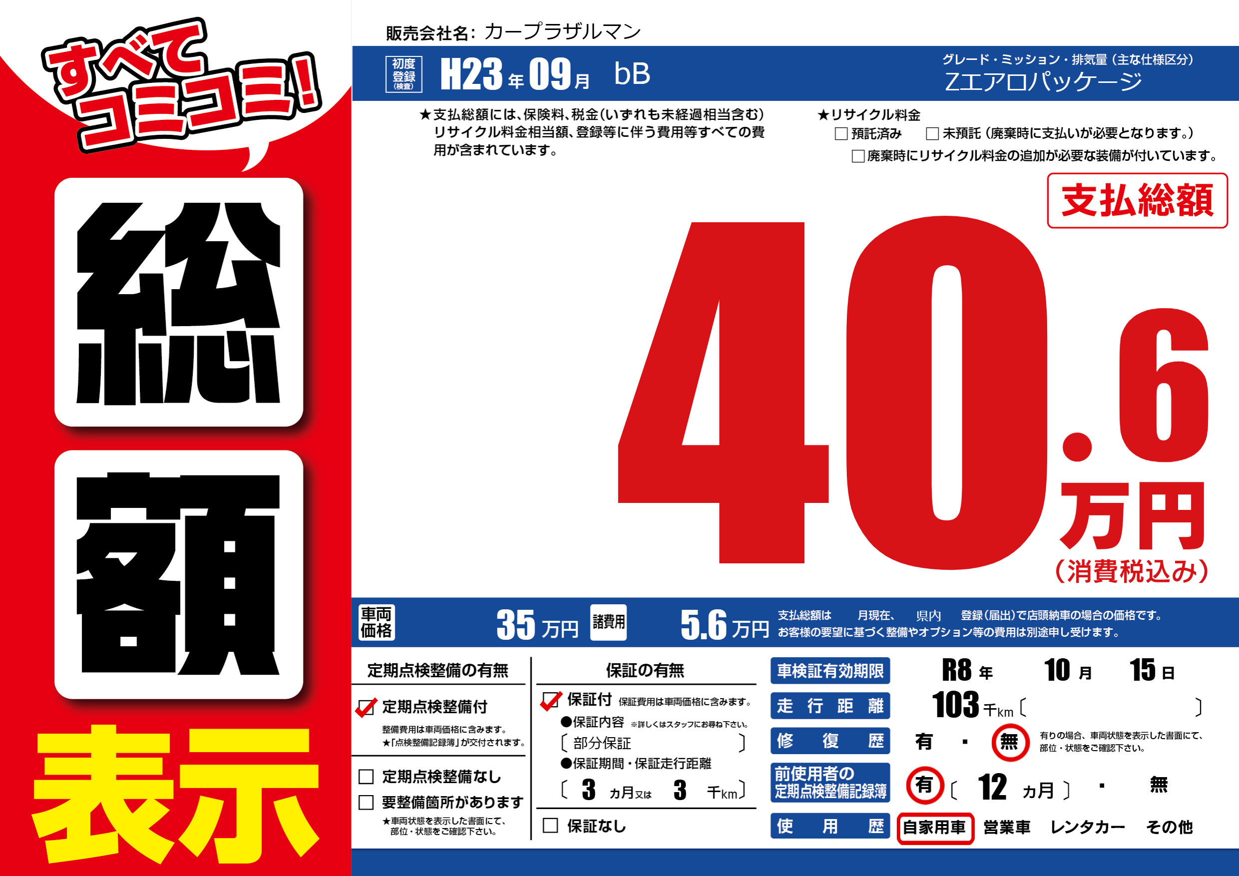 | 走行キロ | 10.3万km | 初年度登録 | H23年09月 |