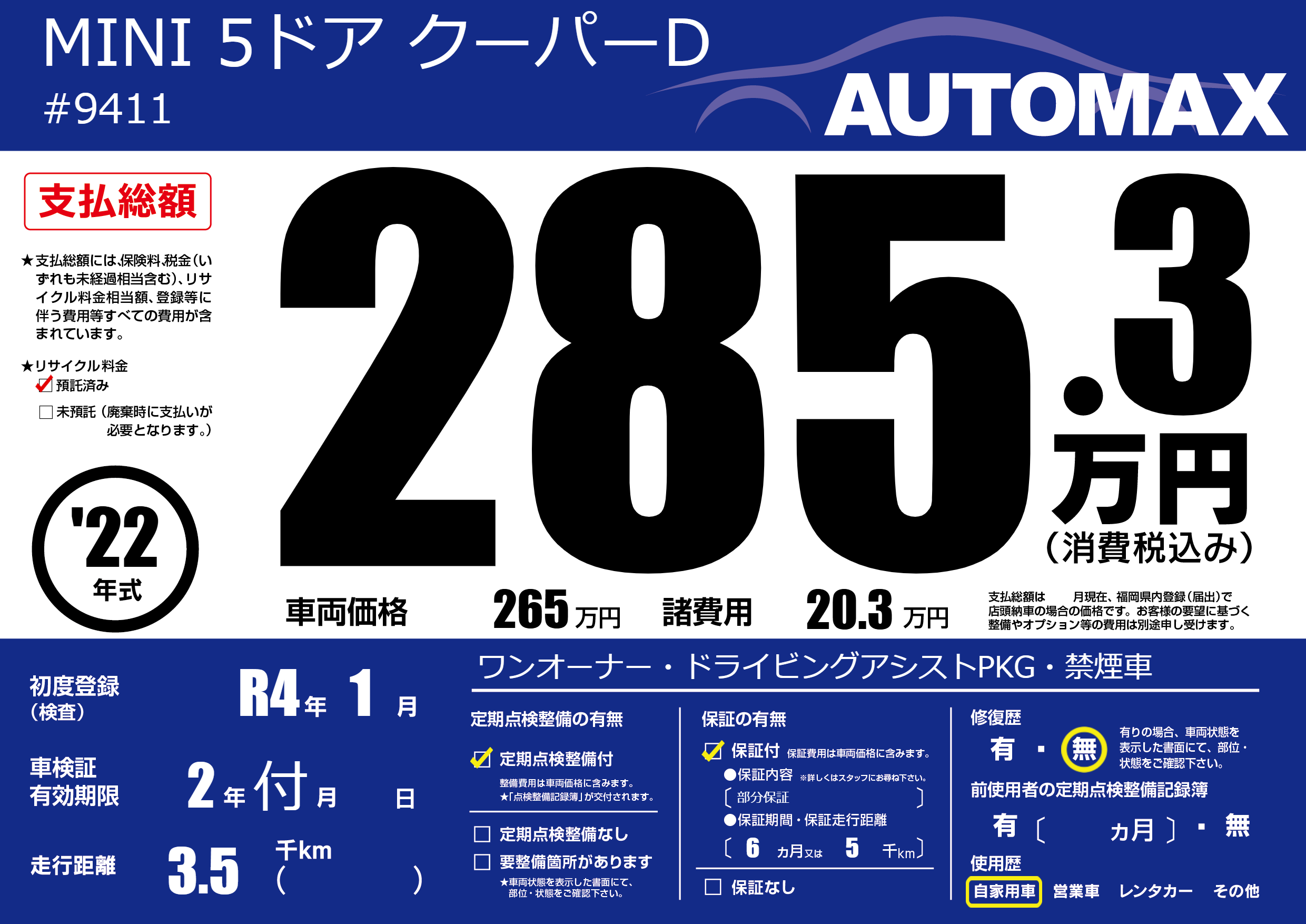 | 走行キロ | 0.3万km | 初年度登録 | R4年1月 |