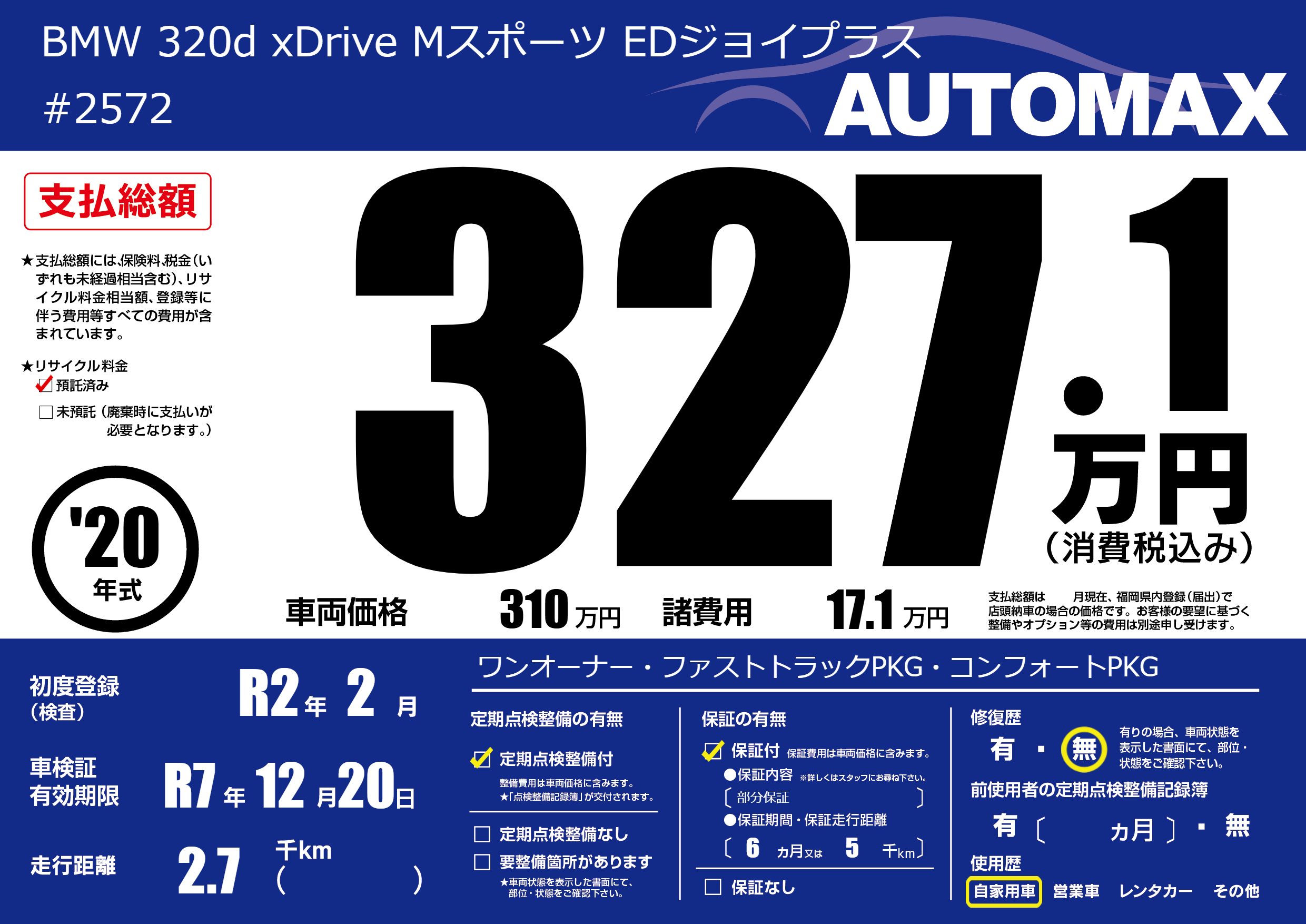 | 車名 | BMW 320d xDrive Mスポーツ EDジョイプラス | グレード ミッション 排気量 |
