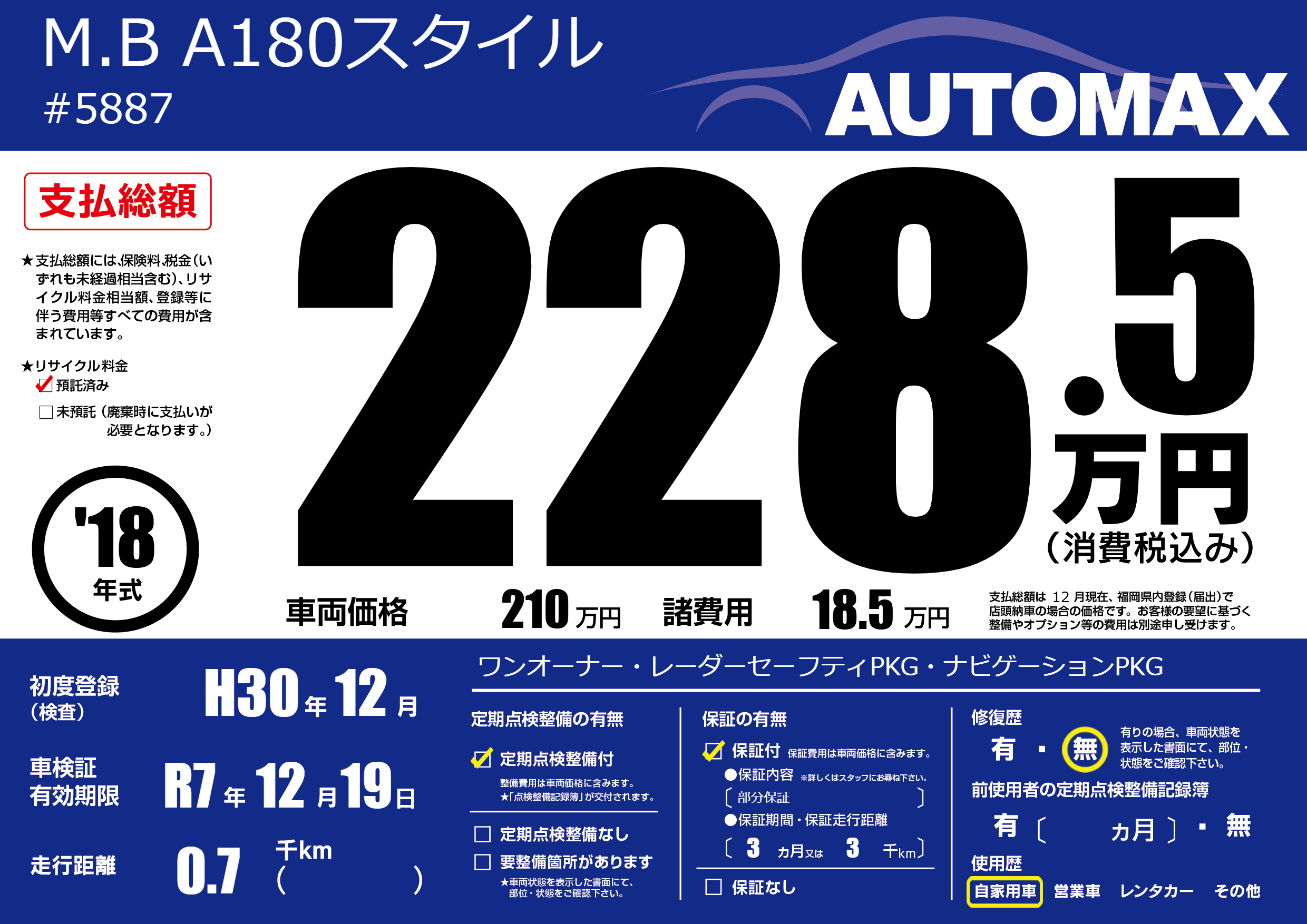 | 車名 | M.B A180スタイル | グレード ミッション 排気量 |