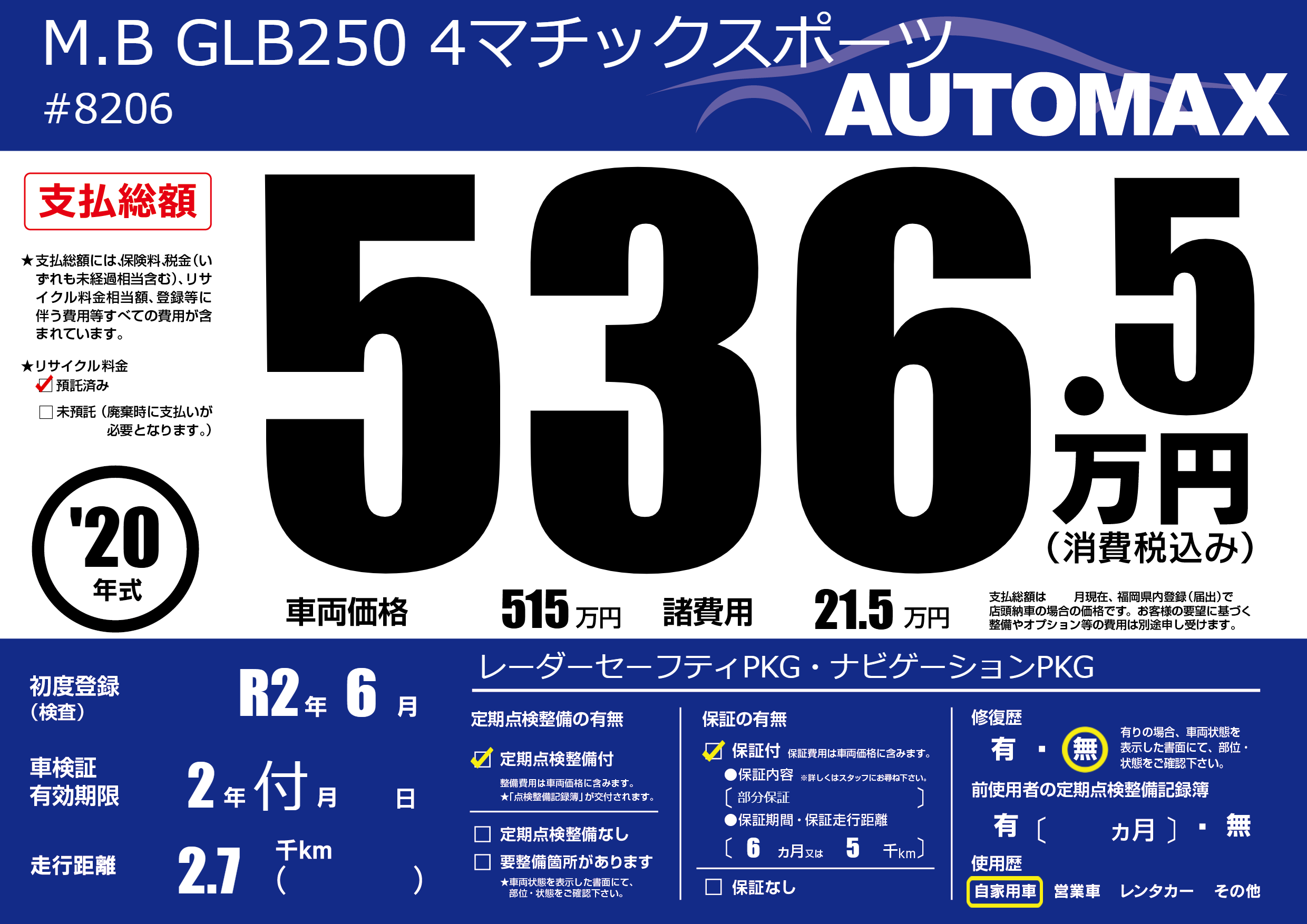 | 車名 | M.B GLB250 4マチックスポーツ | グレード ミッション 排気量 |