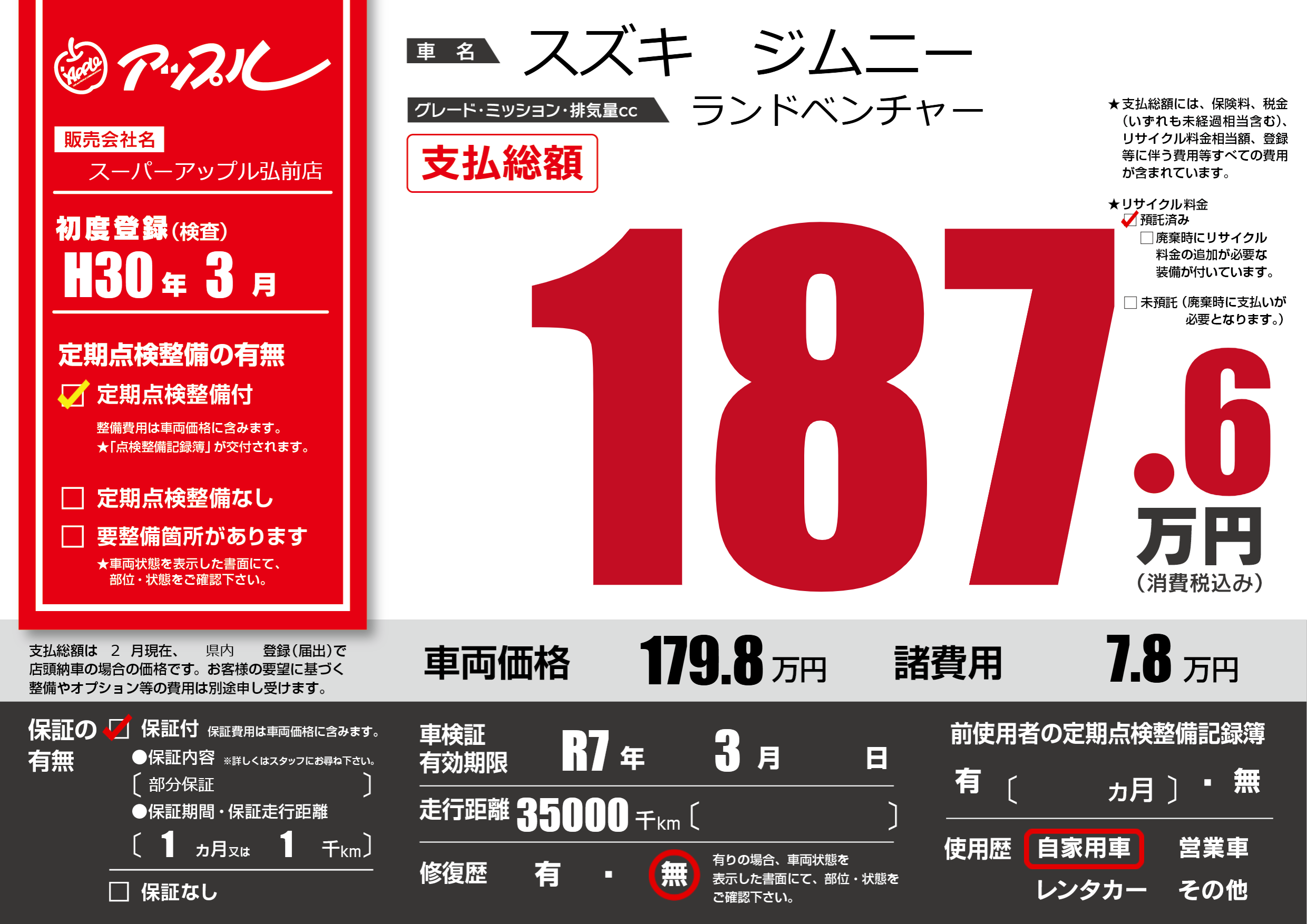 | 車検制限 | R7年 3月 - 日 | ||
