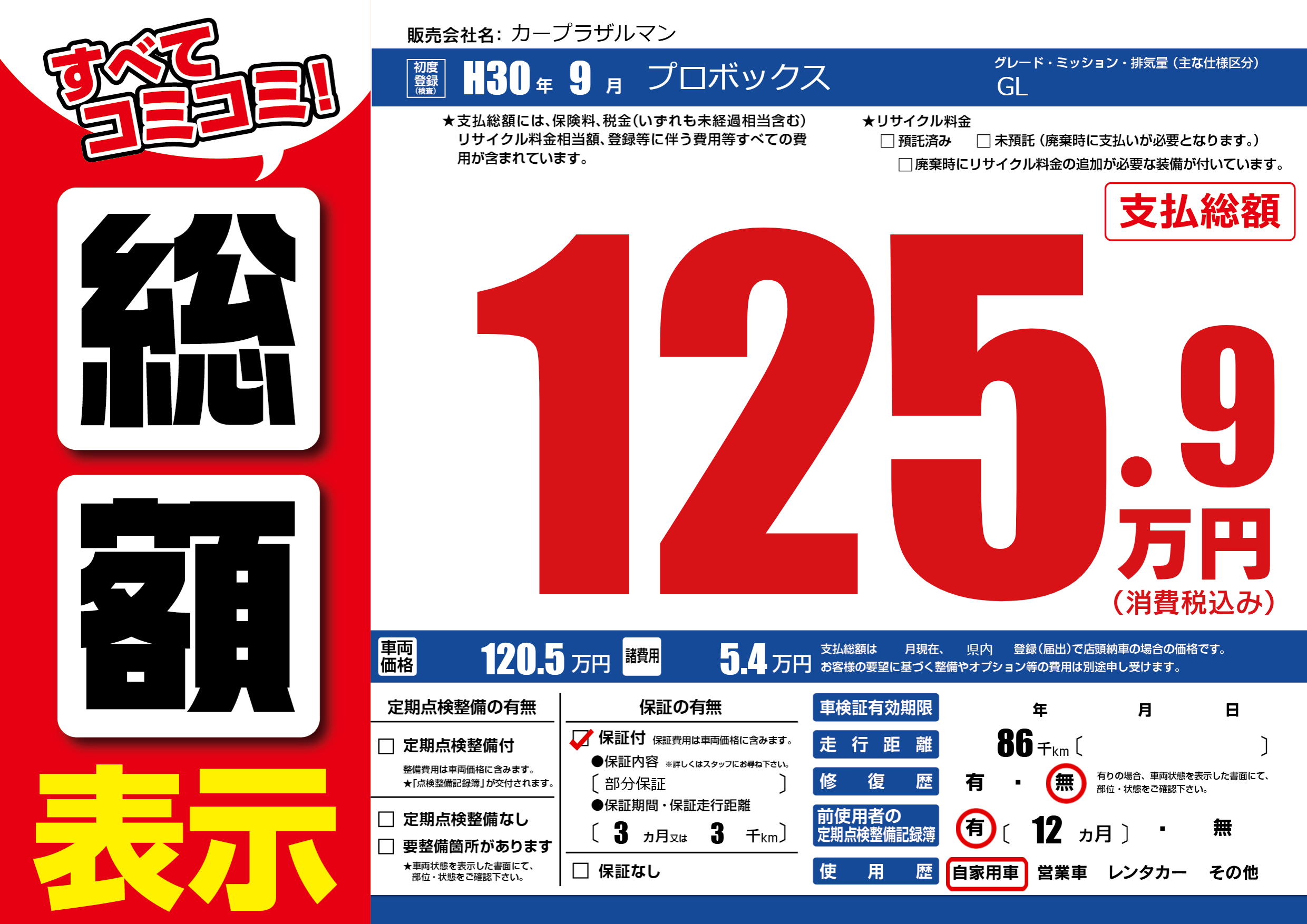 | 車名 | プロボックス | グレード ミッション 排気量 |