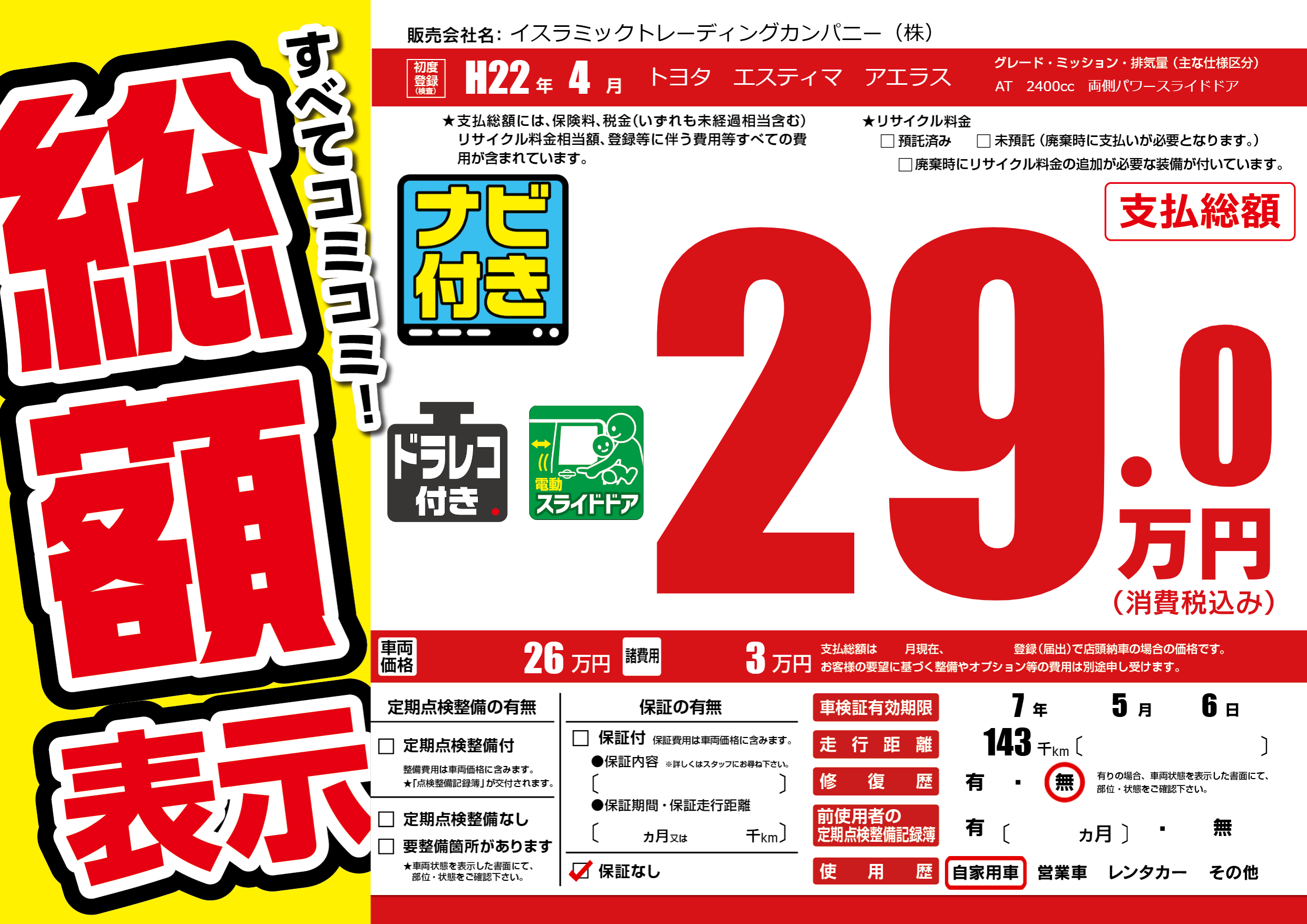 | 車名 | トヨタ エスティマ アエラス | グレード ミッション 排気量 |