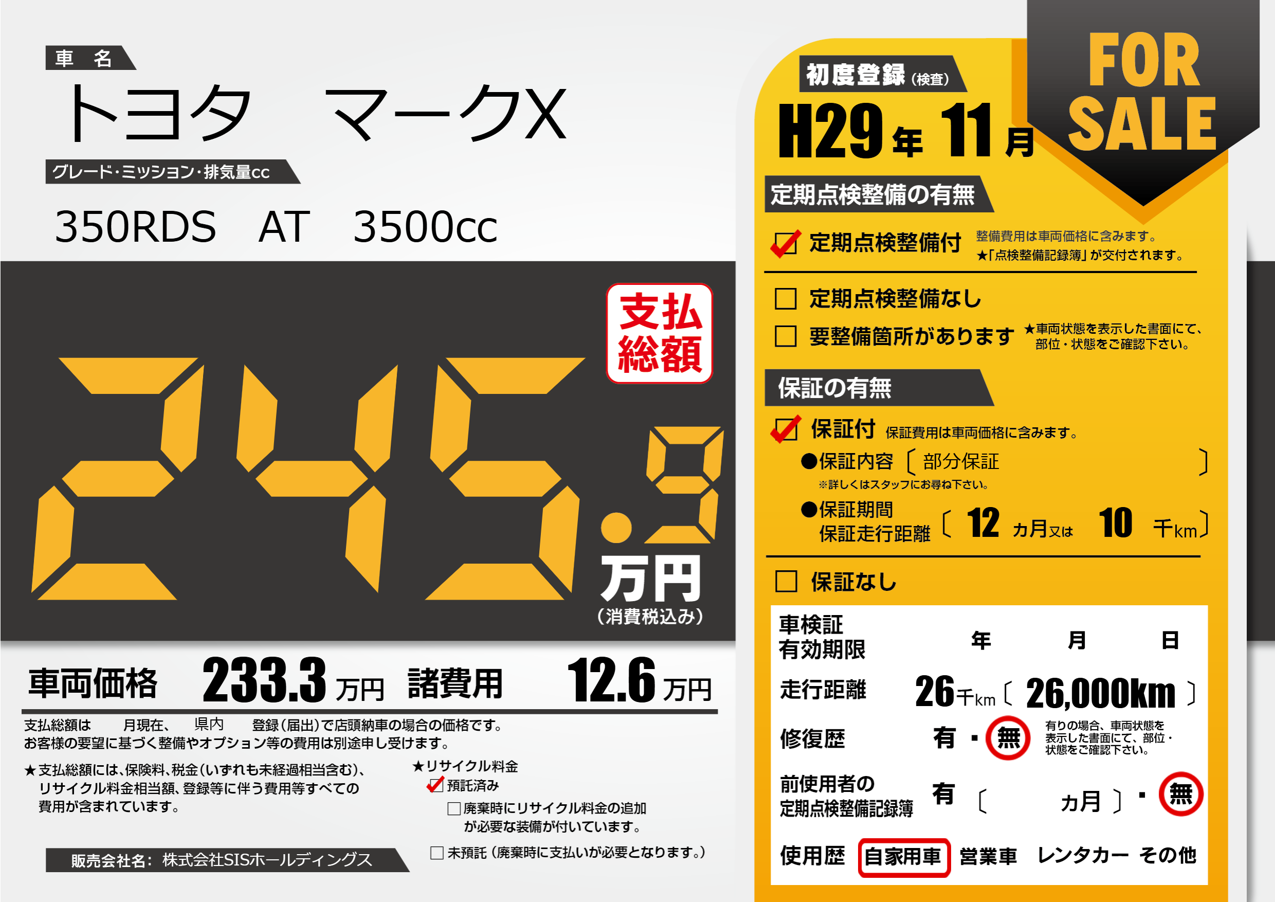 | 車名 | トヨタ マークX | グレード ミッション 排気量 |