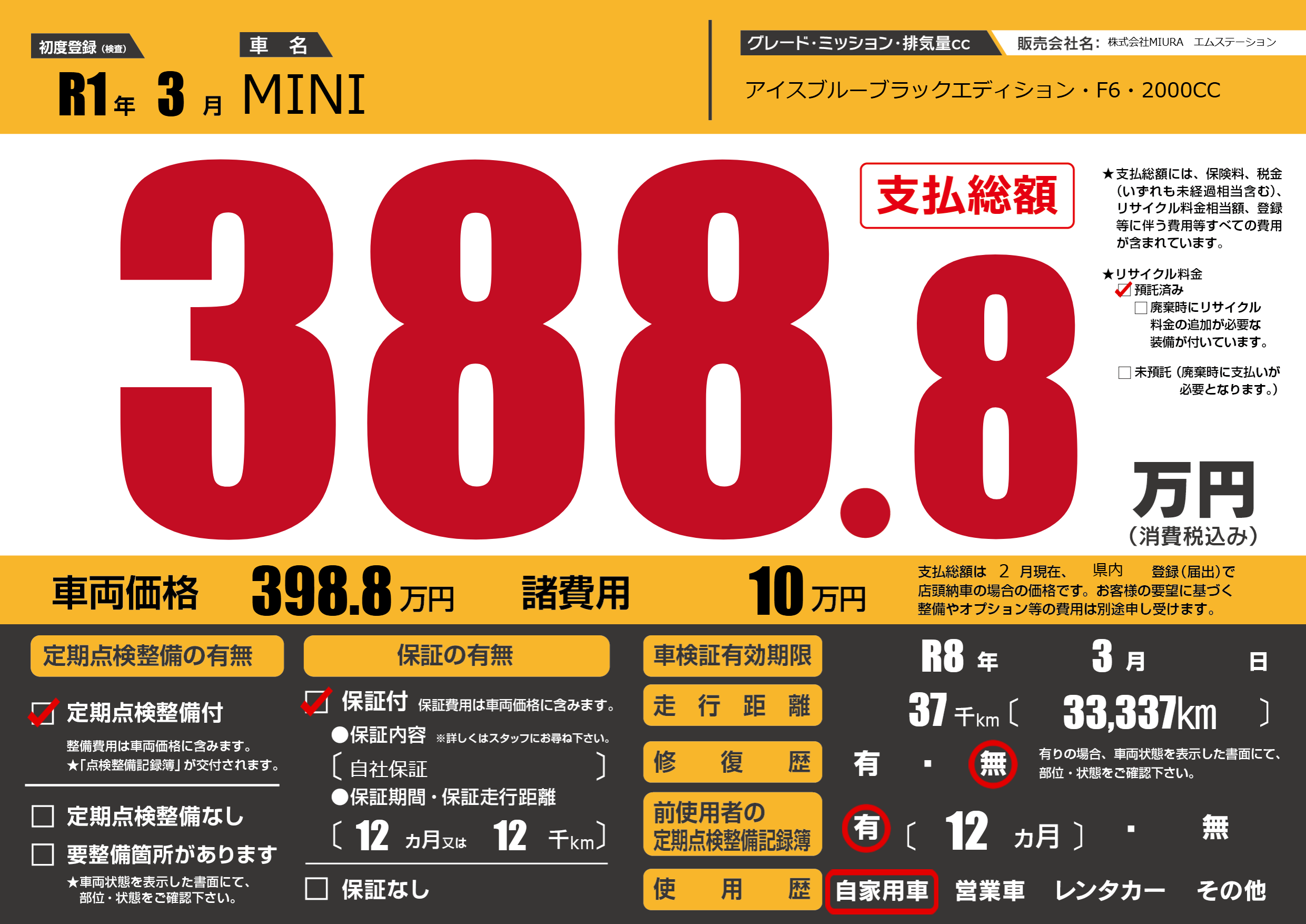 | 走行キロ | 3.7万km | 初年度登録 | R1年3月 |