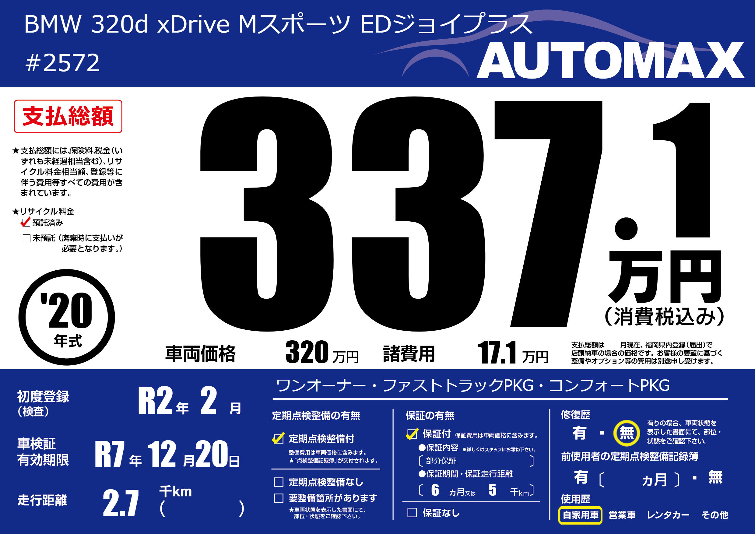 | 車名 | BMW 320d xDrive Mスポーツ EDジョイプラス | グレード ミッション 排気量 |