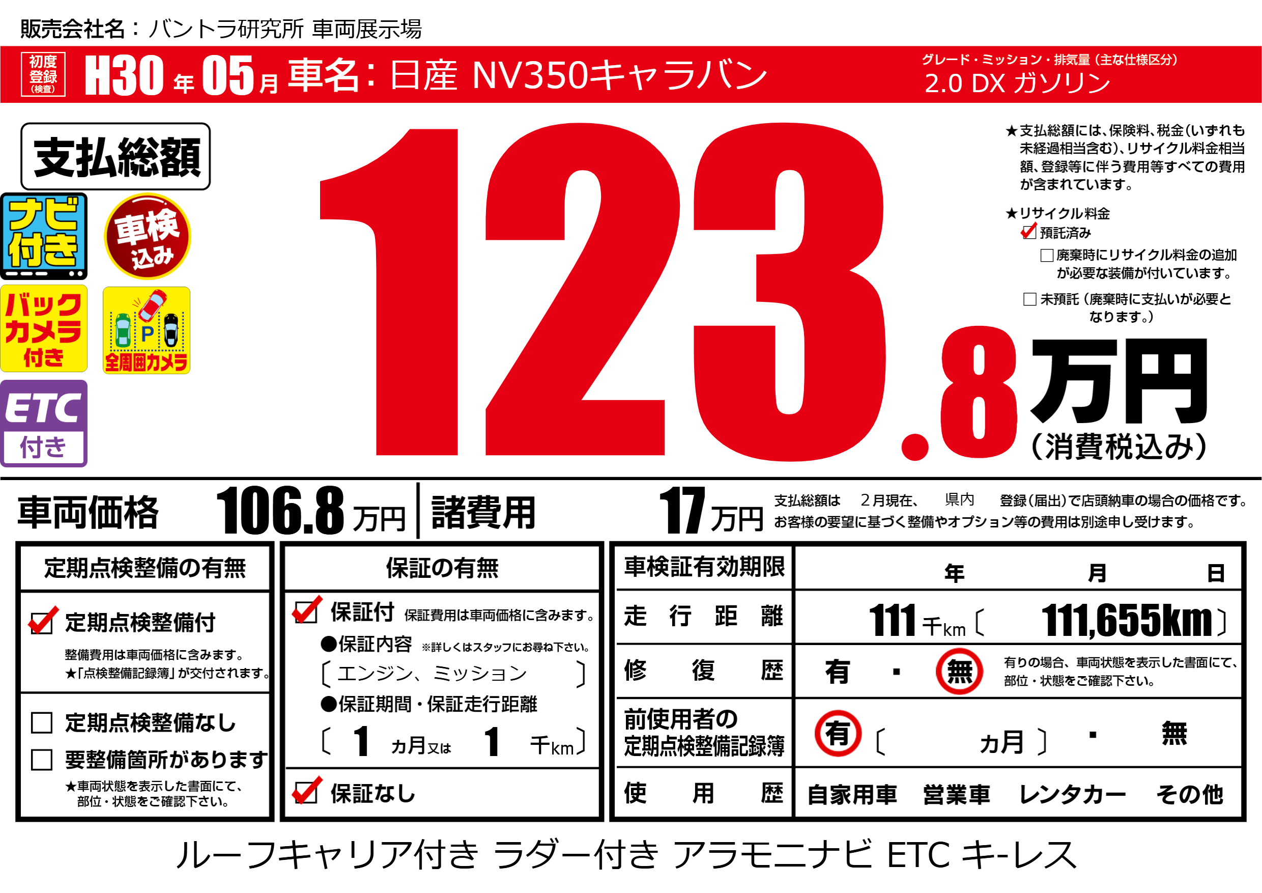 | 走行キロ | 11.1万km | 初年度登録 | H30年05月 |