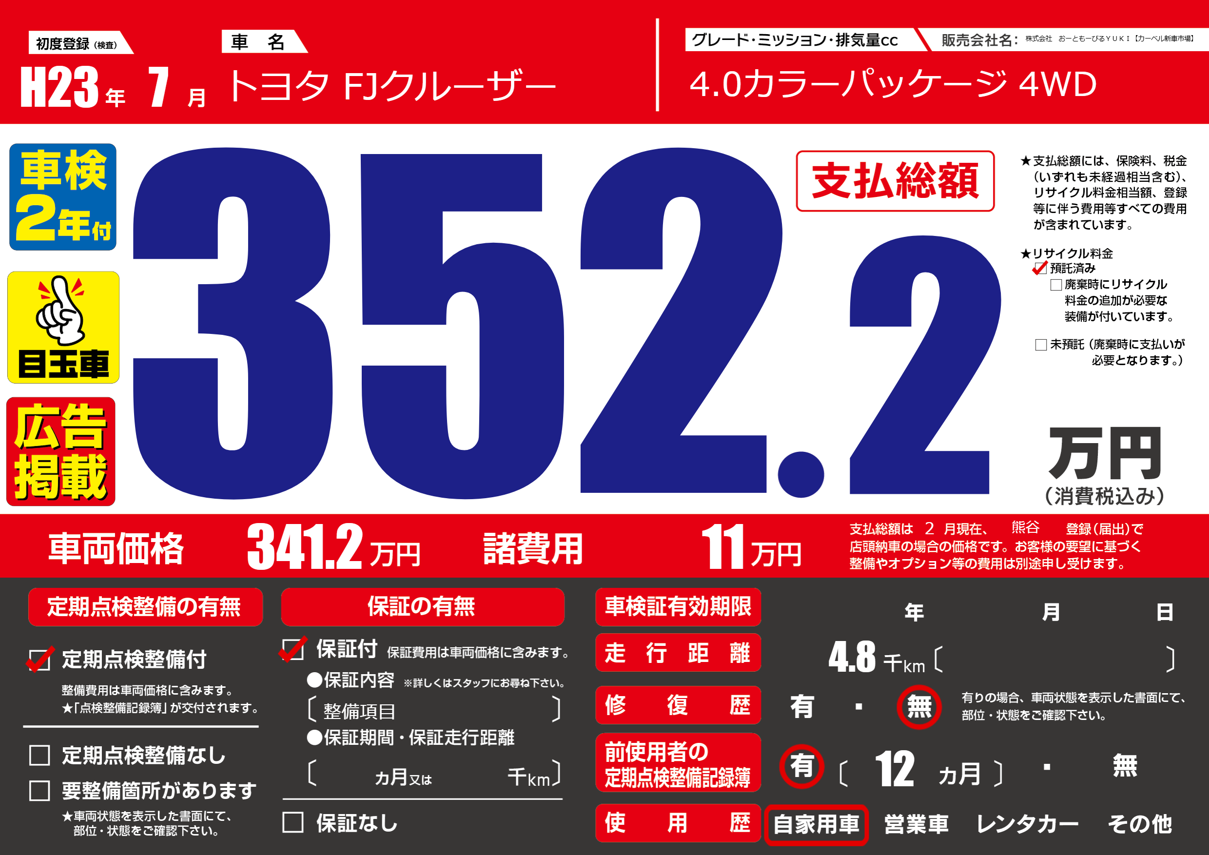 | 走行キロ | 0.4万km | 初年度登録 | H23年7月 |
