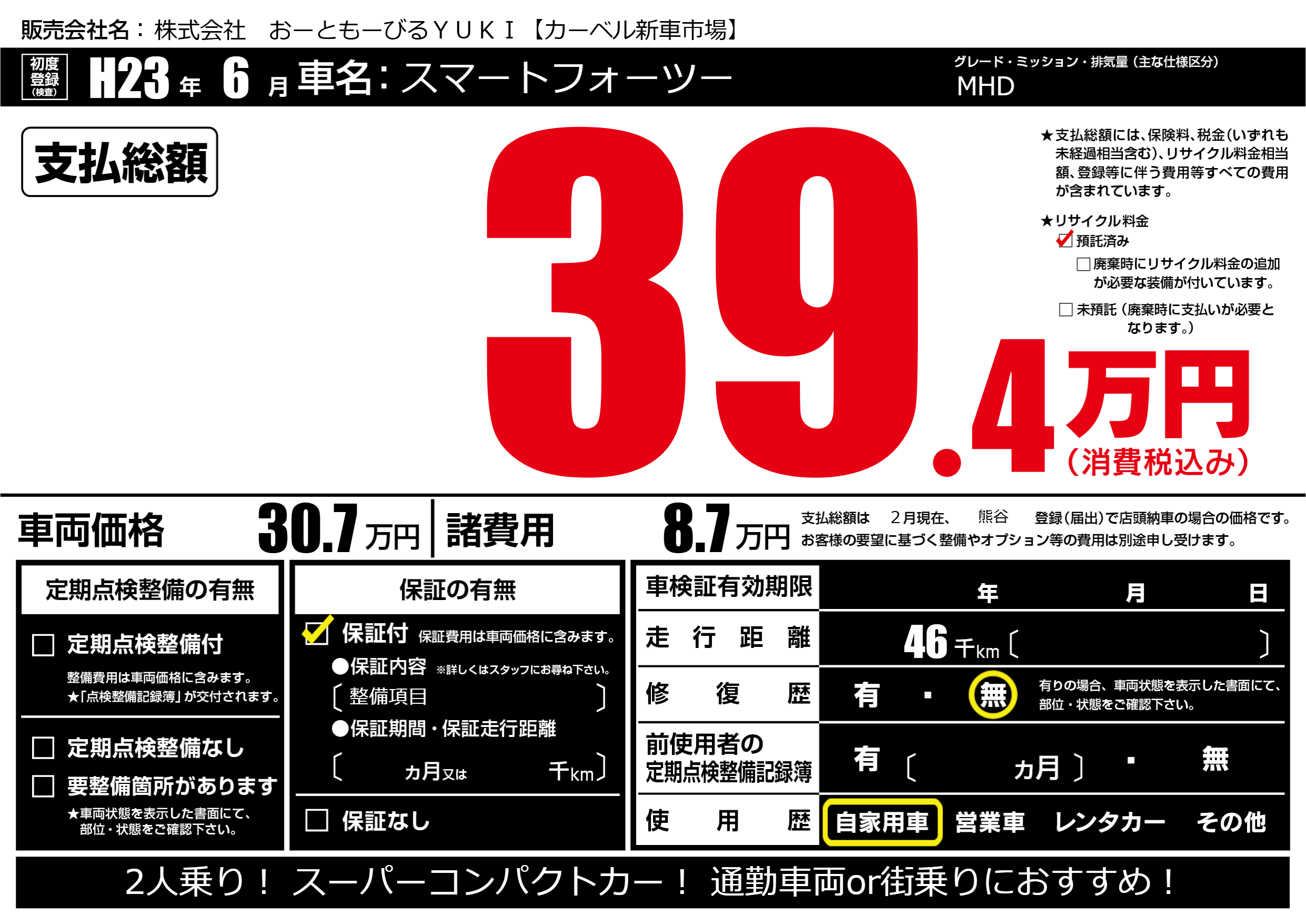 | 車名 | スマートフォーツー | グレード ミッション 排気量 |