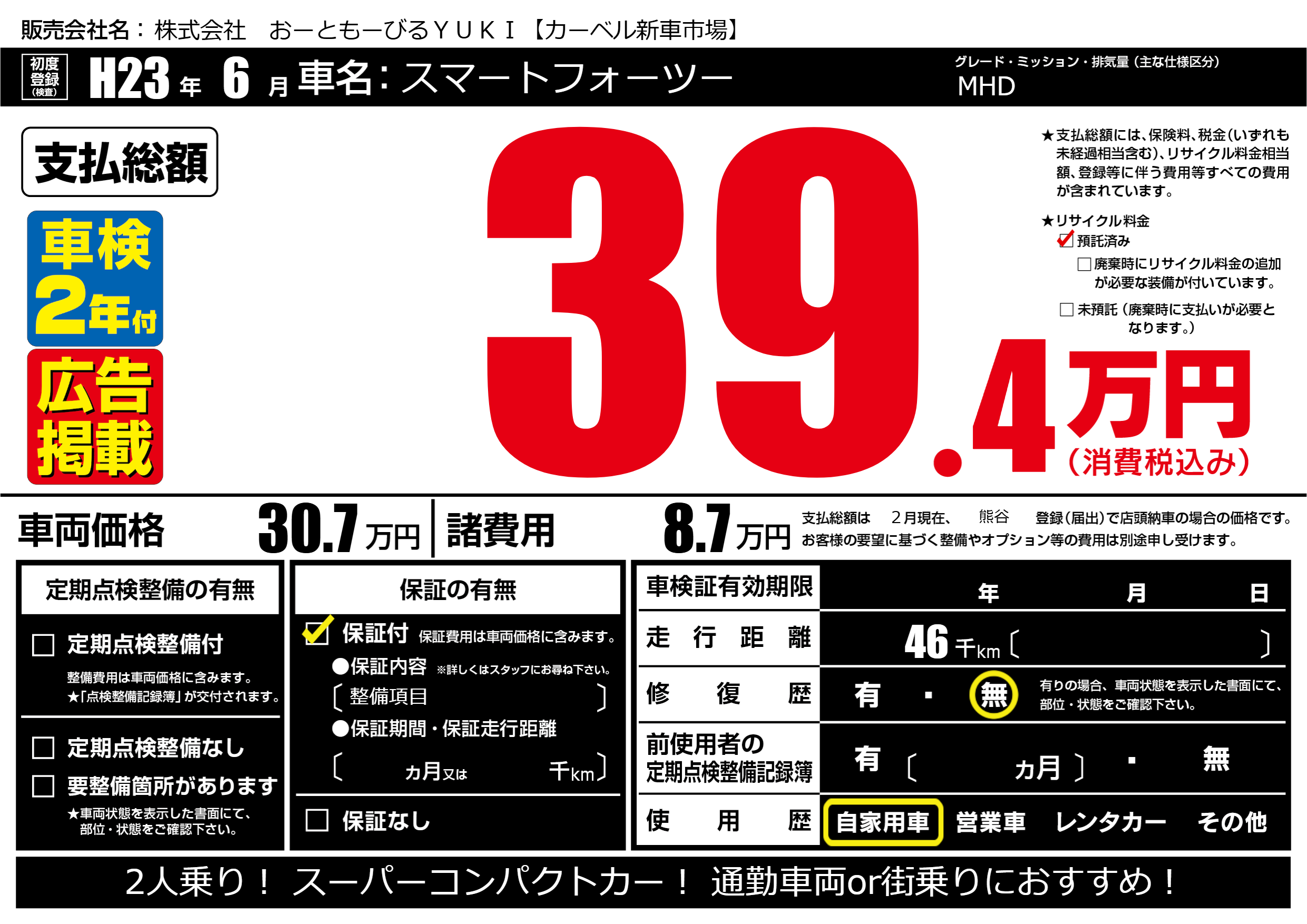 | 車名 | スマートフォーツー | グレード ミッション 排気量 |