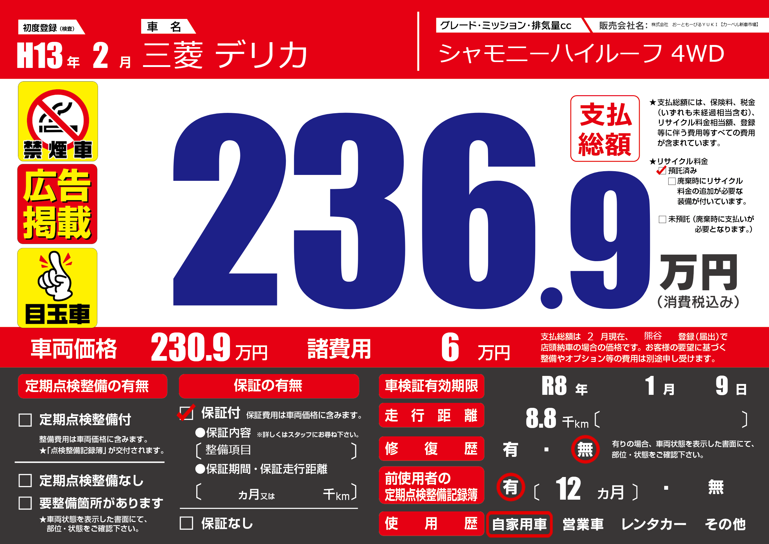 | 走行キロ | 0.8万km | 初年度登録 | H13年2月 |