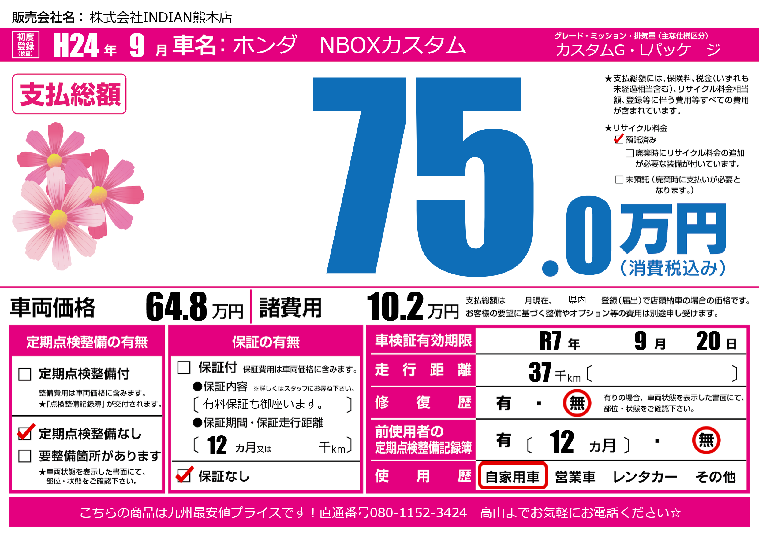 | 走行キロ | 3.7万km | 初年度登録 | H24年9月 |