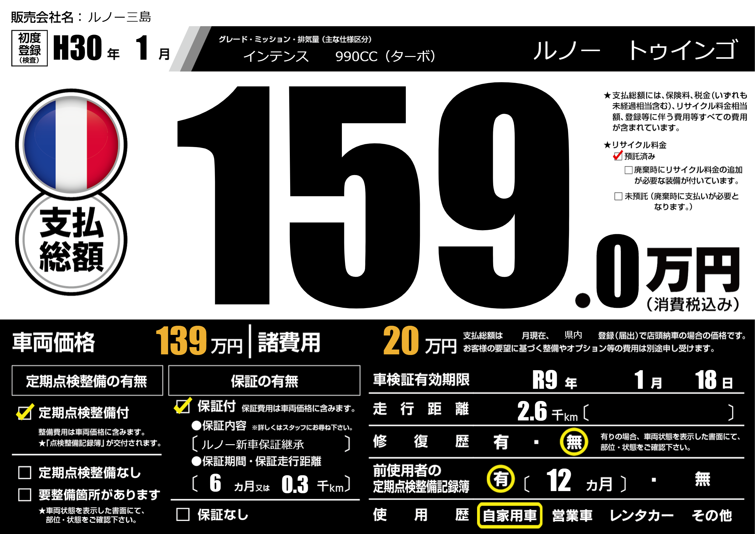 | 車名 | ルノー トゥインゴ | グレード ミッション 排気量 |